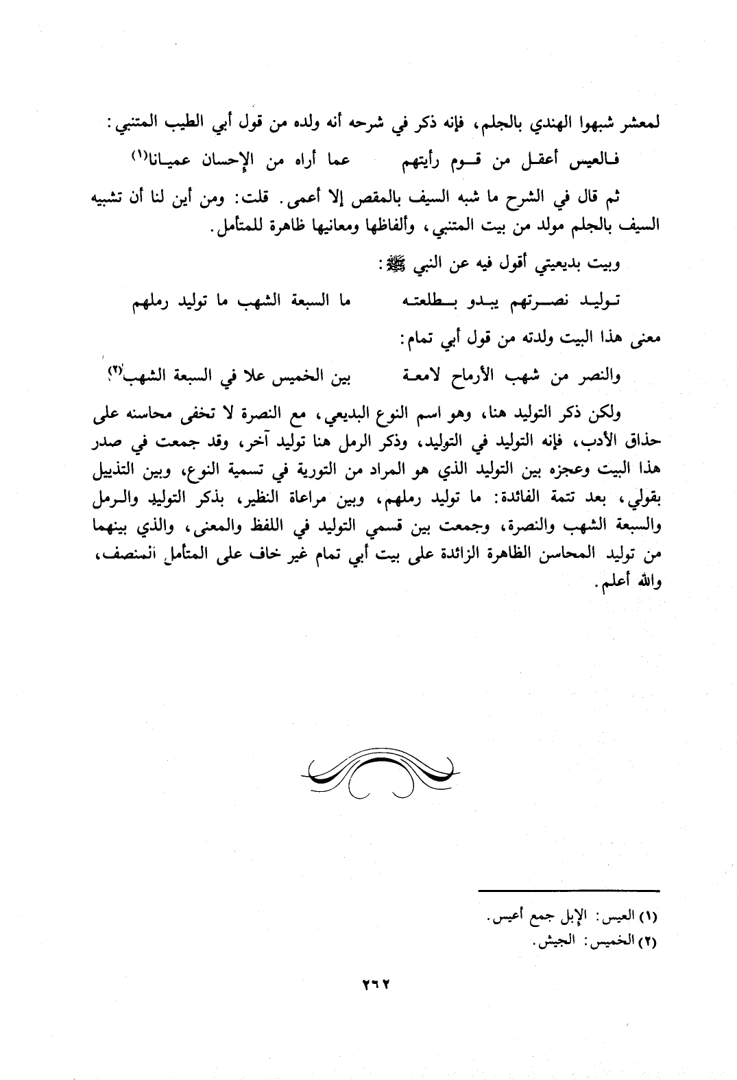 ولكن ذكر التوليد هنا، وهو اسم النوع البديعي، مع النصرة لا تخفى محاسنه على حذاق الأدب، فإنه التوليد في التوليد، وذكر الرمل هنا توليد آخر، وقد جمعت في صدر هذا البيت وعجزه بين التوليد الذي هو المراد من التورية في تسمية النوع، وبين التذييل بقولي، بعد تتمة الفائدة: ما توليد رملهم، وبين مراعاة النظير، بذكر التوليد والرمل والسبعة الشهب والنصرة، وجمعت بين قسمي التوليد في اللفظ والمعنى، والذي بينهما من توليد المحاسن الظاهرة الزائدة على بيت أبي تمام غير خاف على المتأمل المنصف، والله أعلم.