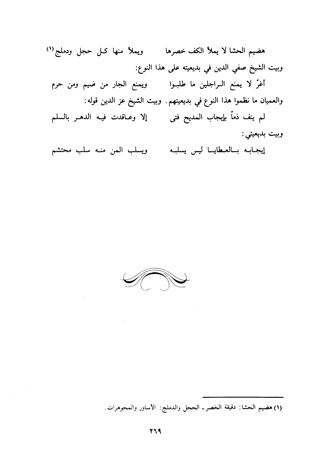 وبيت الشيخ صفي الدين في بديعيته على هذا النوع: