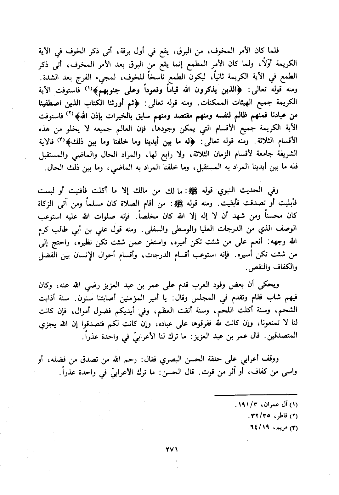 فلما كان الأمر المخوف، من البرق، يقع في أول برقة، أتى ذكر الخوف في الآية الكريمة أولًا، ولما كان الأمر المطمع إنما يقع من البرق بعد الأمر المخوف، أتى ذكر الطمع في الآية الكريمة ثانيًا، ليكون الطمع ناسخًا للخوف، لمجيء الفرج بعد الشدة ومنه قوله تعالى: {الَّذِينَ يَذْكُرُونَ اللَّهَ قِيَامًا وَقُعُودًا وَعَلَى جُنُوبِهِمْ} 1 فاستوفت الآية الكريمة جميع الهيئات الممكنات. ومنه قوله تعالى: {ثُمَّ أَوْرَثْنَا الْكِتَابَ الَّذِينَ اصْطَفَيْنَا مِنْ عِبَادِنَا فَمِنْهُمْ ظَالِمٌ لِنَفْسِهِ وَمِنْهُمْ مُقْتَصِدٌ وَمِنْهُمْ سَابِقٌ بِالْخَيْرَاتِ بِإِذْنِ اللَّه} 2 فاستوفت الآية الكريمة جميع الأقسام التي يمكن وجودها، فإن العالم جميعه لا يخلو من هذه الأقسام الثلاثة. ومنه قوله تعالى: {لَهُ مَا بَيْنَ أَيْدِينَا وَمَا خَلْفَنَا وَمَا بَيْنَ ذَلِكَ} 3 فالآية الشريفة جامعة لأقسام الزمان الثلاثة، ولا رابع لها، والمراد الحالي والماضي والمستقبل فله ما بين أيدينا المراد به المستقبل، وما خلفنا المراد به الماضي، وما بين ذلك الحال.