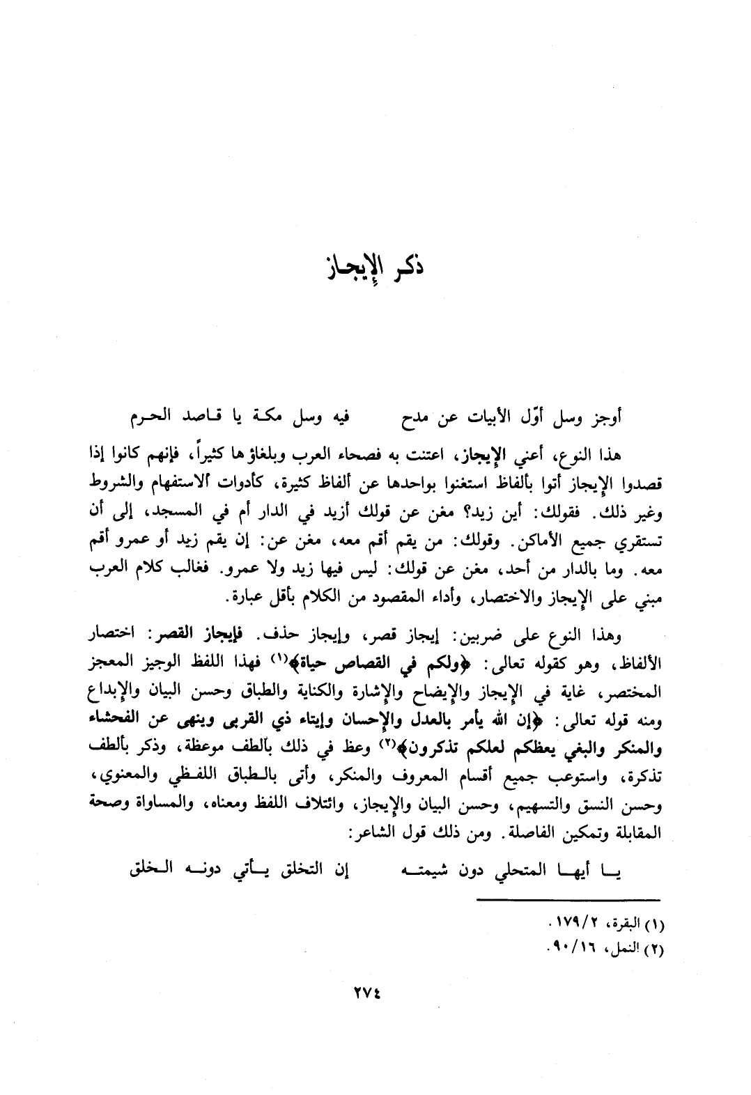 وهذا النوع على ضربين: إيجاز قصر، وإيجاز حذف. فإيجاز القصر: اختصار الألفاظ، وهو كقوله تعالى: {وَلَكُمْ فِي الْقِصَاصِ حَيَاةٌ} 1 فهذا اللفظ الوجيز المعجز المختصر، غاية في الإيجاز والإيضاح والإشارة والكناية والطباق وحسن البيان والإبداع ومنه قوله تعالى: {إِنَّ اللَّهَ يَأْمُرُ بِالْعَدْلِ وَالإِحْسَانِ وَإِيتَاءِ ذِي الْقُرْبَى وَيَنْهَى عَنِ الْفَحْشَاءِ وَالْمُنْكَرِ وَالْبَغْيِ يَعِظُكُمْ لَعَلَّكُمْ تَذَكَّرُونَ} 2 وعظ في ذلك بألطف موعظة، وذكر بألطف تذكرة، واستوعب جميع أقسام المعروف والمنكر، وأتى بالطباق اللفظي والمعنوي، وحسن النسق والتسهيم، وحسن البيان والإيجاز، وائتلاف اللفظ ومعناه، والمساواة وصحة المقابلة وتمكين الفاصلة. ومن ذلك قول الشاعر: