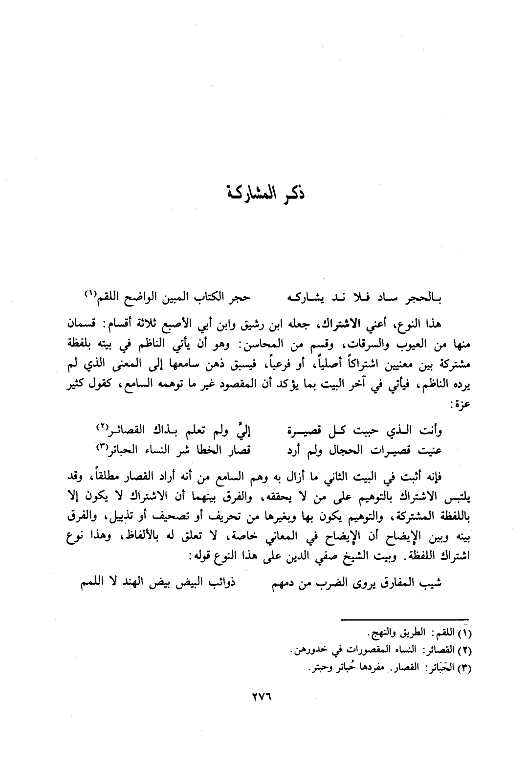فإنه أثبت في البيت الثاني ما أزال به وهم السامع من أنه أراد القصار مطلقًا، وقد يلتبس الاشتراك بالتوهيم على من لا يحققه، والفرق بينهما أن الاشتراك لا يكون إلا باللفظة المشتركة، والتوهيم يكون بها وبغيرها من تحريف أو تصحيف أو تذييل، والفرق بينه وبين الإيضاح أن الإيضاح في المعاني خاصة، لا تعلق له بالألفاظ، وهذا نوع اشتراك اللفظة. وبيت الشيخ صفي الدين على هذا النوع قوله: