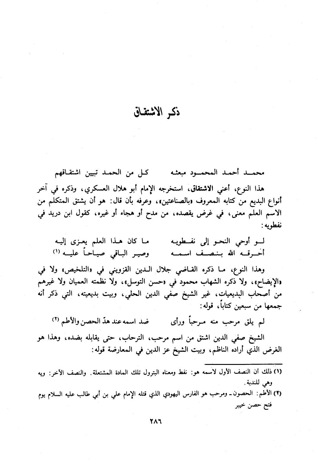 هذا النوع، أعني الاشتقاق، استخرجه الإمام أبو هلال العسكري، وذكره في آخر أنواع البديع من كتابه المعروف "بالصناعتين"، وعرفه بأن قال: هو أن يشتق المتكلم من الاسم العلم معنى، في غرض يقصده، من مدح أو هجاء أو غيره، كقول ابن دريد في نفطويه: