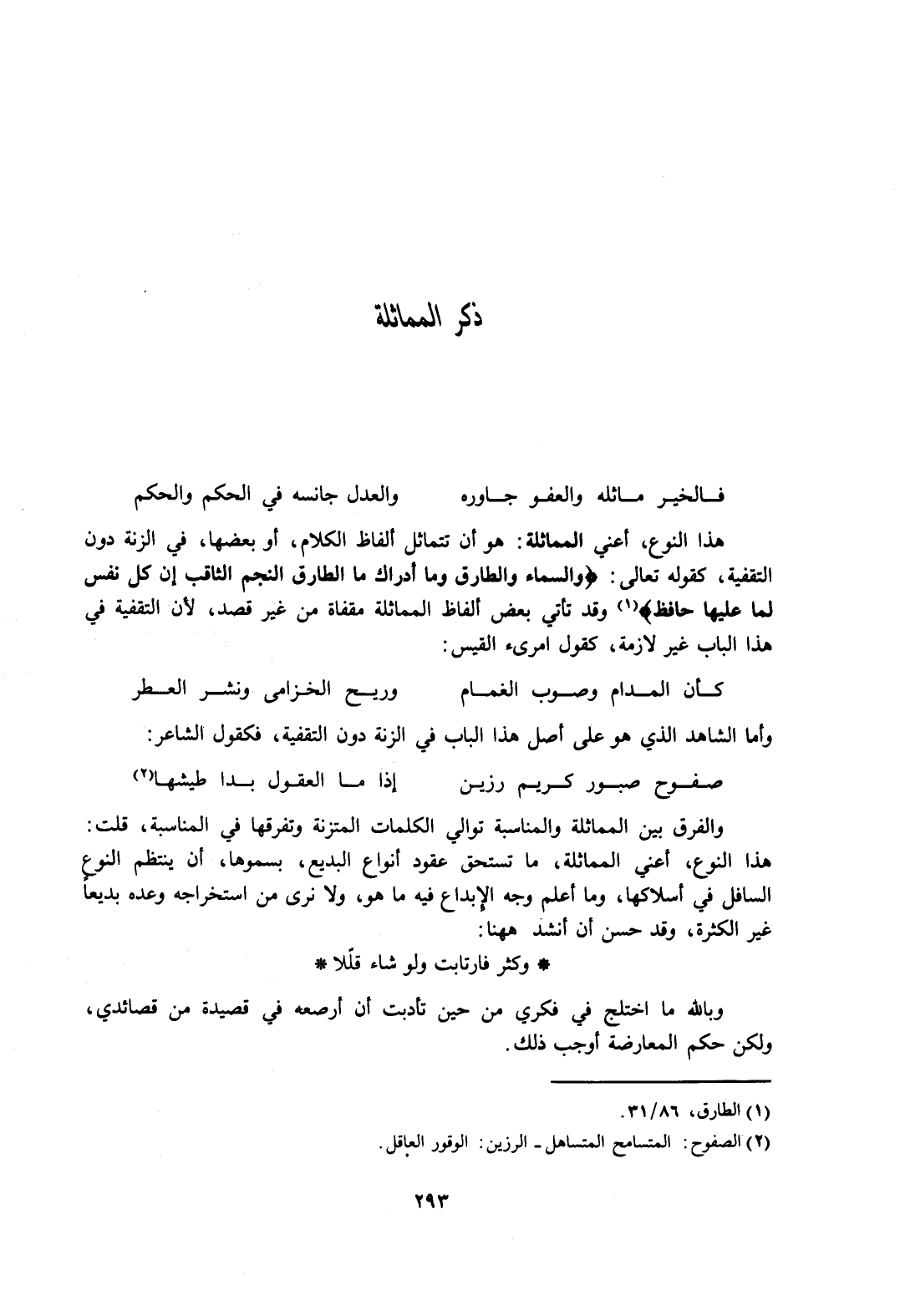 هذا النوع، أعني المماثلة: هو أن تتماثل ألفاظ الكلام، أو بعضها، في الزنة دون التقفية، كقوله تعالى: {وَالسَّمَاءِ وَالطَّارِقِ، وَمَا أَدْرَاكَ مَا الطَّارِقُ، النَّجْمُ الثَّاقِبُ، إِنْ كُلُّ نَفْسٍ لَمَّا عَلَيْهَا حَافِظٌ} 1 وقد تأتي ألفاظ المماثلة مقفاة من غير قصد؛ لأن التقفية في هذا الباب غير لازمة، كقول امرئ القيس: