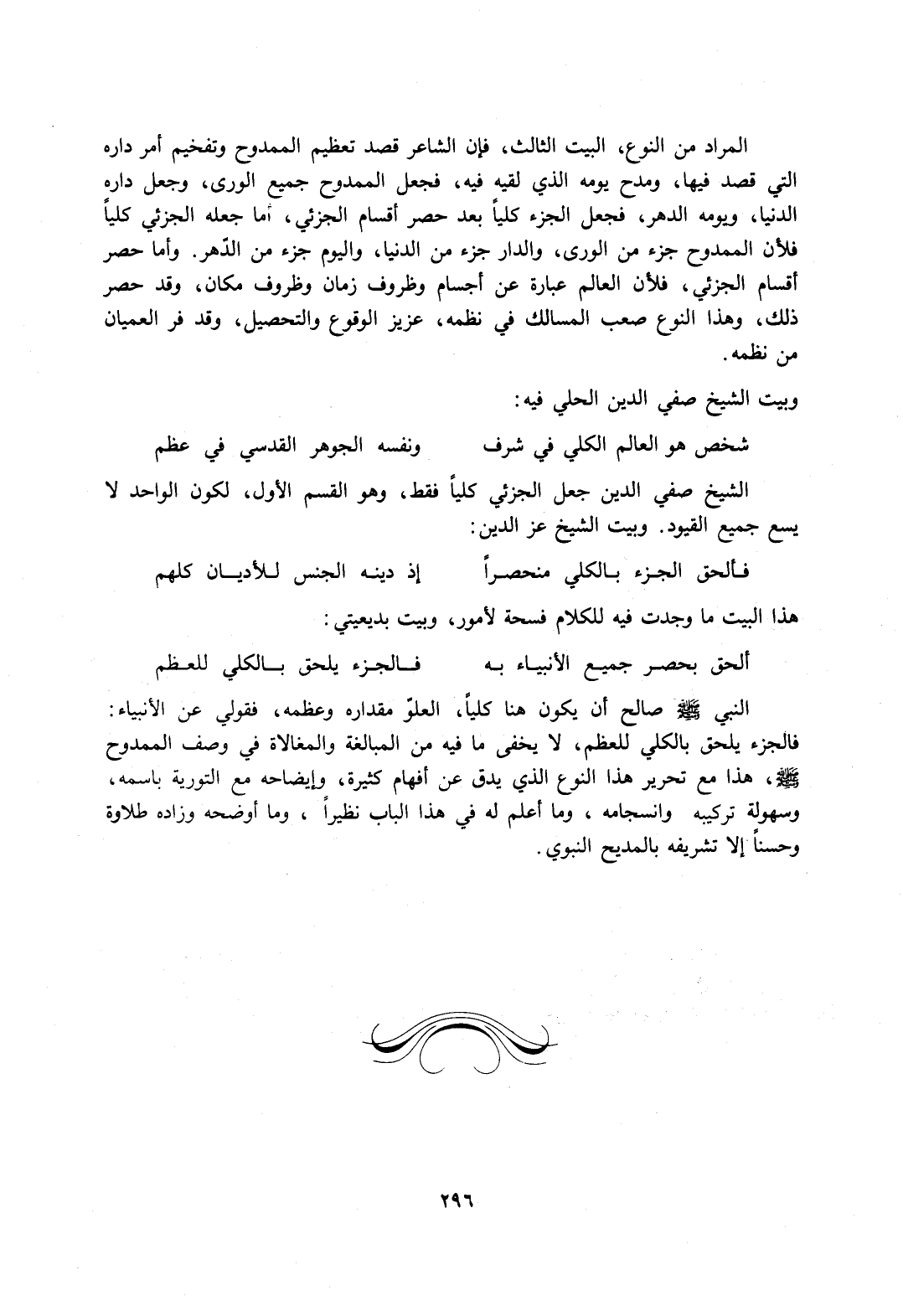 النبي -صلى الله عليه وسلم- صالح أن يكون هنا كليًّا، العلو مقداره وعظمه، فقولي عن الأنبياء: فالجزء يلحق بالكلي للعظم، لا يخفى ما فيه من المبالغة والمغالاة في وصف الممدوح، صلى الله عليه وسلم، هذا مع تحرير هذا النوع الذي يدق عن أفهام كثيرة، وإيضاحه مع التورية باسمه، وسهولة تركيبه وانسجامه، وما أعلم له في هذا الباب نظيرًا، وما أوضحه وزاده طلاوة وحسنًا إلا تشريفه بالمديح النبوي.