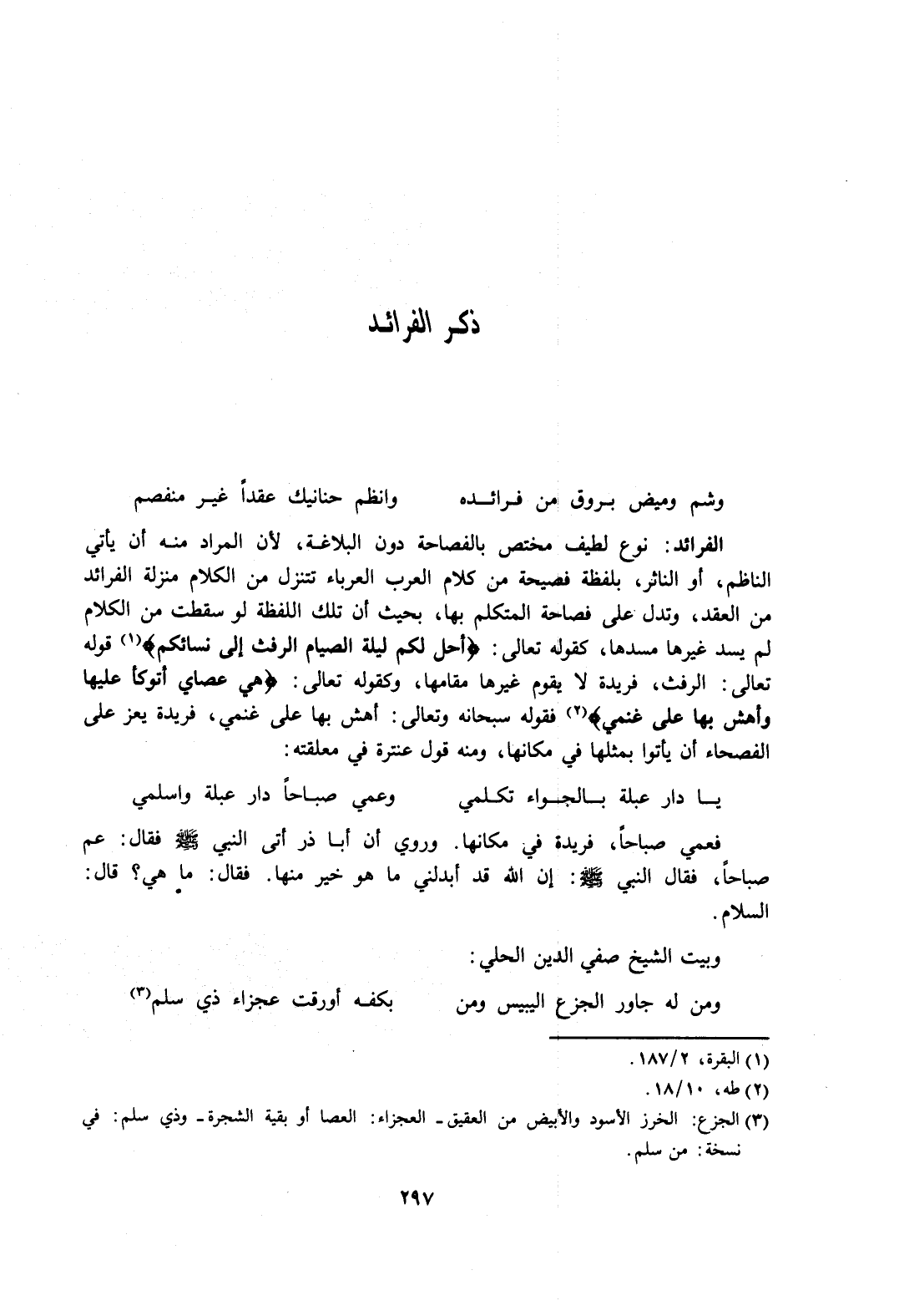 الفرائد: نوع لطيف مختص بالفصاحة دون البلاغة؛ لأن المراد منه أن يأتي الناظم، أو الناثر، بلفظة فصيحة من كلام العرب العرباء تتنزل من الكلام منزلة الفرائد من العقد، وتدل على فصاحة المتكلم بها، بحيث أن تلك اللفظة لو سقطت من الكلام لم يسد غيرها مسدها، كقوله تعالى: {أُحِلَّ لَكُمْ لَيْلَةَ الصِّيَامِ الرَّفَثُ إِلَى نِسَائِكُمْ} 1 قوله تعالى: الرفث، فريدة لا يقوم غيرها مقامها، وكقوله تعالى: {هِيَ عَصَايَ أَتَوَكَّأُ عَلَيْهَا وَأَهُشُّ بِهَا عَلَى غَنَمِي} 2 فقوله سبحانه وتعالى: أهش بها على غنمي، فريدة يعز على الفصحاء أن يأتوا بمثلها في مكانها، ومنه قول عنترة في معلقته: