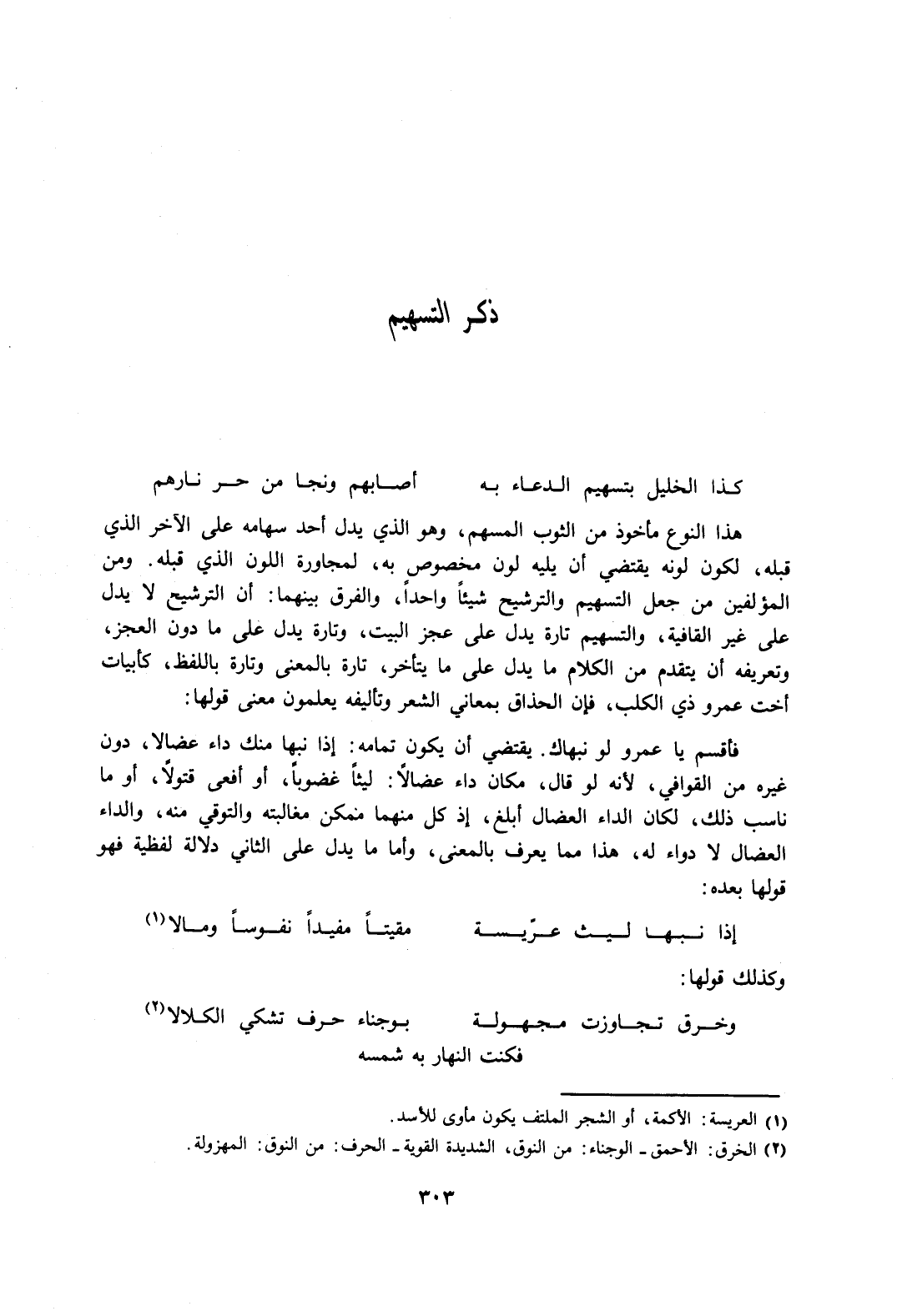 هذا النوع مأخوذ من الثوب المسهم، وهو الذي يدل أحد سهامه على الآخر الذي قبله، لكون لونه يقتضي أن يليه لون مخصوص به، لمجاورة اللون الذي قبله. ومن المؤلفين من جعل التسهيم والترشيح شيئًا واحدًا، والفرق بينهما: أن الترشيح لا يدل على غير القافية، والتسهيم تارة يدل على عجز البيت، وتارة يدل على ما دون العجز، وتعريفه أن يتقدم من الكلام ما يدل على ما يتأخر، تارة بالمعنى وتارة باللفظ، كأبيات أخت عمرو ذي الكلب، فإن الحذاق بمعاني الشعر وتأليفه يعلمون معنى قولها: