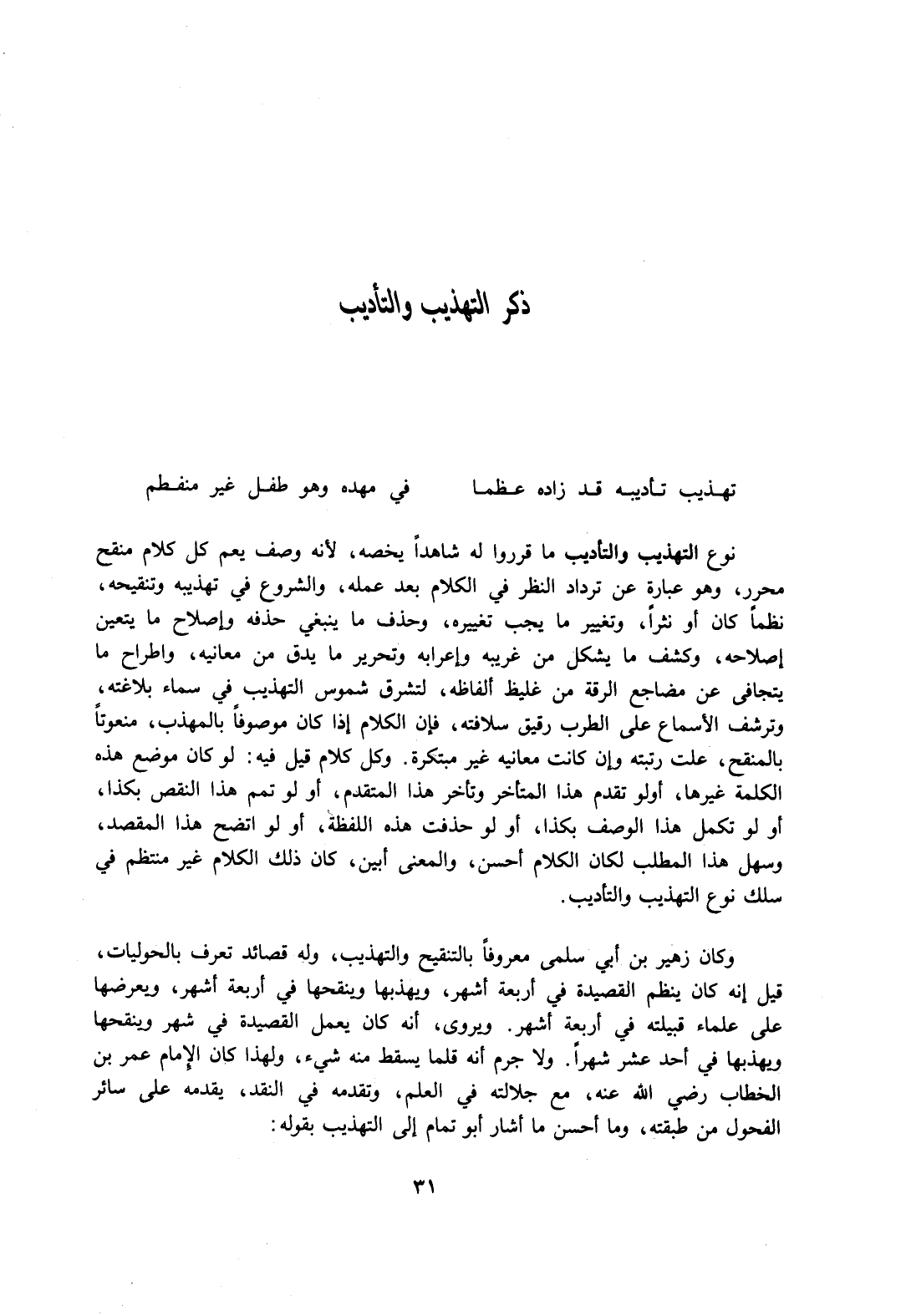 وكان زهير بن أبي سلمى معروفًا بالتنقيح والتهذيب، وله قصائد تعرف بالحوليات، قيل: إنه كان ينظم القصيدة في أربعة أشهر، ويهذبها وينقحها في أربعة أشهر، ويعرضها على علماء قبيلته في أربعة أشهر. ويروى، أنه كان يعمل القصيدة في شهر وينقحها ويهذبها في أحد عشر شهرًا. ولا جرم أنه قلما يسقط منه شيء، ولهذا كان الإمام عمر بن الخطاب -رضي الله عنه- مع جلالته في العلم، وتقدمه في النقد، يقدمه على سائر الفحول من طبقته، وما أحسن ما أشار أبو تمام إلى التهذيب بقوله: