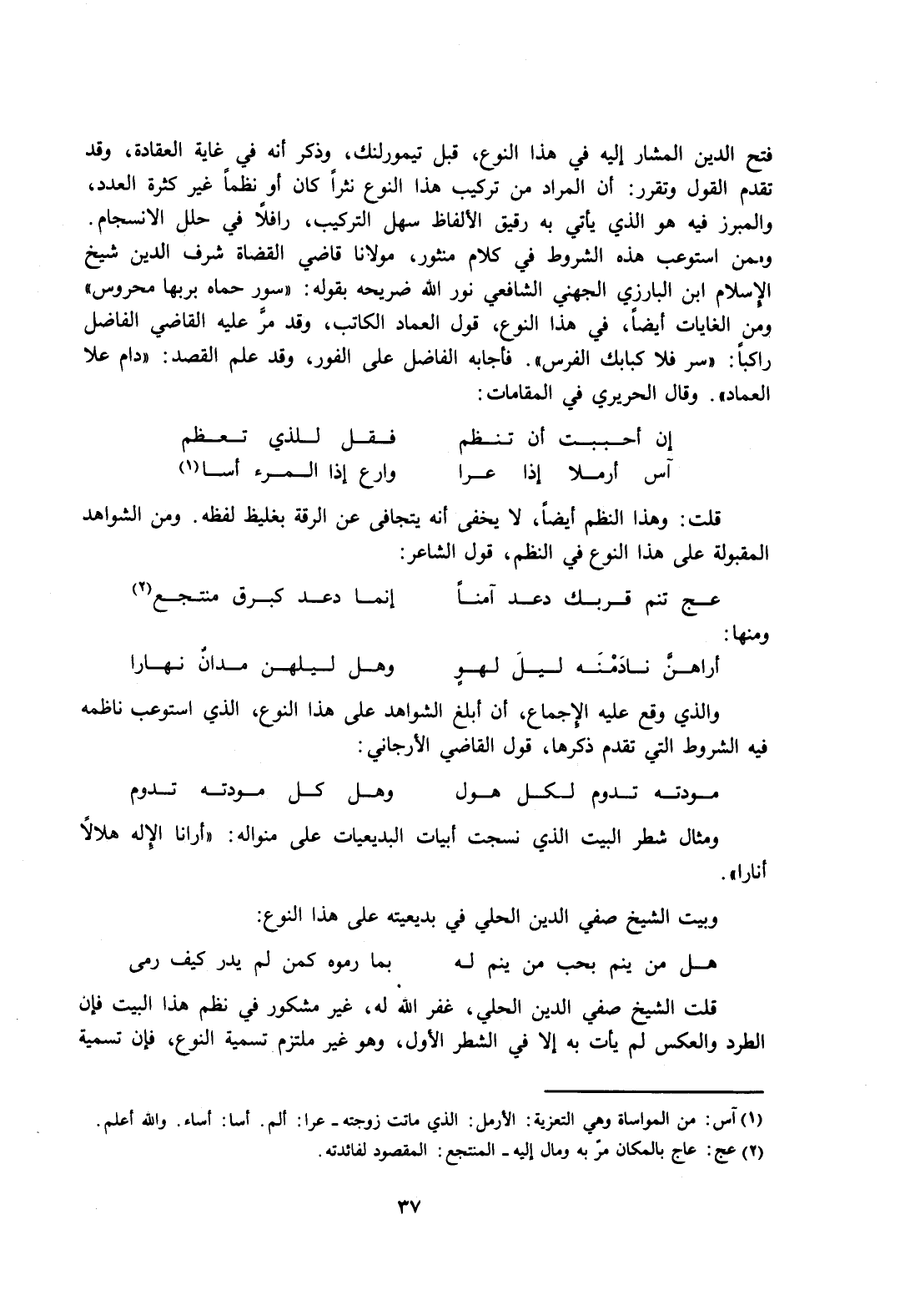 فتح الدين المشار إليه في هذا النوع، قبل تيمورلنك، وذكر أنه في غاية العقادة، وقد تقدم القول وتقرر: أن المراد من تركيب هذا النوع نثرًا كان أو نظمًا غير كثرة العدد، والمبرز فيه هو الذي يأتي به رقيق الألفاظ سهل التركيب، رافلًا في حلل الانسجام. وممن استوعب هذه الشروط في كلام منثور، مولانا قاضي القضاة شرف الدين شيخ الإسلام ابن البارزي الجهني الشافعي نور الله ضريحه بقوله: "سور حماه بربها محروس" ومن الغايات أيضًا، في هذا النوع، قول العماد الكاتب، وقد مر عليه القاضي الفاضل راكبًا: "سر فلا كبابك الفرس". فأجابه الفاضل على الفور، وقد علم القصد: "دام علا العماد". وقال الحريري في المقامات: