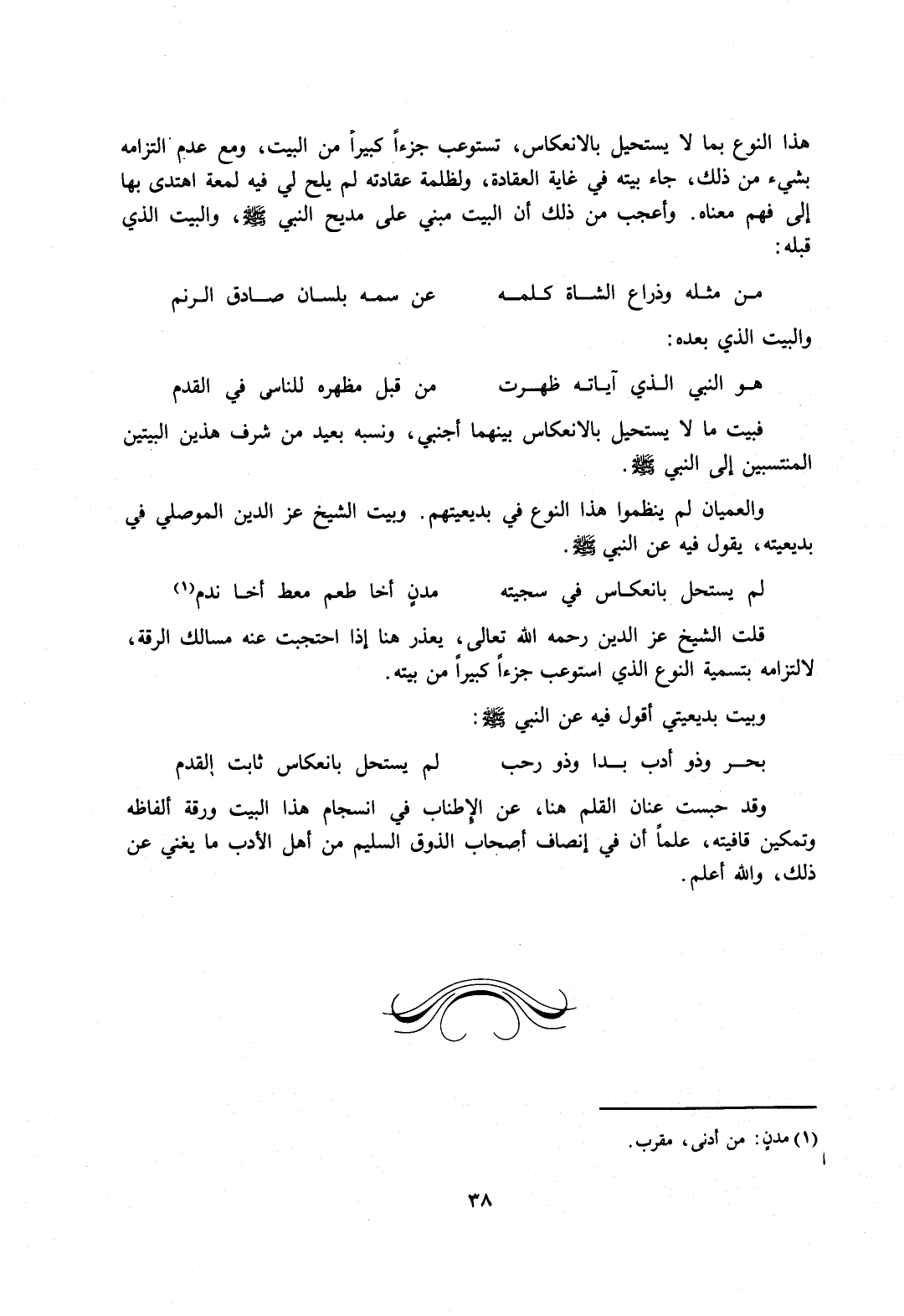 هذا النوع بما لا يستحيل بالانعكاس، تستوعب جزءًا كبيرًا من البيت، ومع عدم التزامه بشيء من ذلك، جاء بيته في غاية العقادة، ولظلمة عقادته لم يلح لي فيه لمعة اهتدى بها إلى فهم معناه. وأعجب من ذلك أن البيت مبني على مديح النبي -صلى الله عليه وسلم- والبيت الذي قبله: