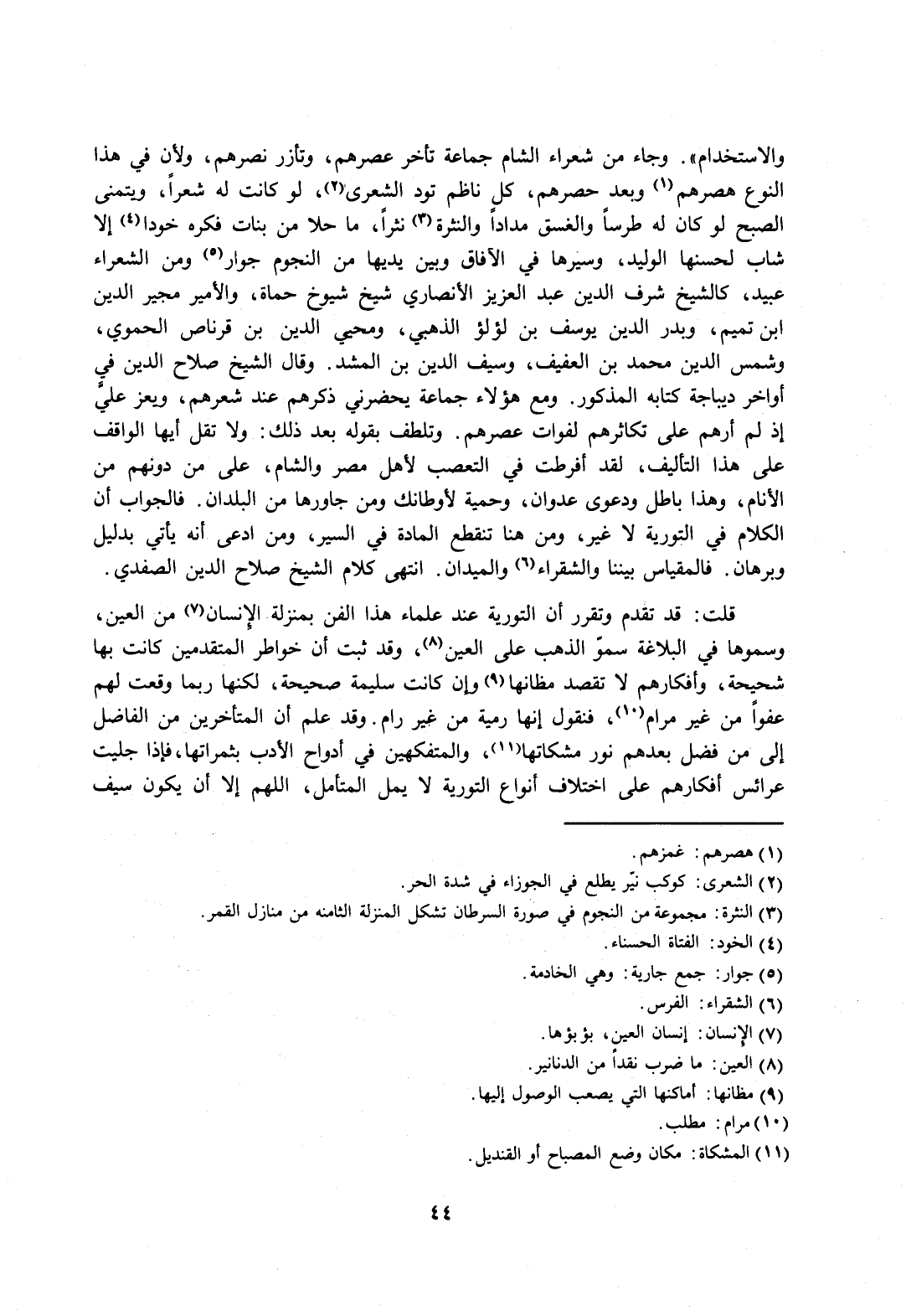 والاستخدام". وجاء من شعراء الشام جماعة تأخر عصرهم، وتأزر نصرهم، ولأن في هذا النوع هصرهم1 وبعد حصرهم، كل ناظم تود الشعرى2، لو كانت له شعرًا، ويتمنى الصبح لو كان له طرسًا والغسق مددًا والنثرة3 نثرًا، ما حلا من بنات فكره خودًا4 إلا شاب لحسنها الوليد، وسيرها في الآفاق وبين يديها من النجوم جوارٍ5 ومن الشعراء عبيد، كالشيخ شرف الدين عبد العزيز الأنصاري شيخ شيوخ حماة، والأمير مجير الدين بن تميم، وبدر الدين يوسف بن لؤلؤ الذهبي، ومحيي الدين بن قرناض الحموي، وشمس الدين محمد بن العفيف، وسيف الدين بن المشد. وقال الشيخ صلاح الدين في أواخر ديباجة كتابه المذكور. ومع هؤلاء جماعة يحضرني ذكرهم عند شعرهم، ويعز عليّ إذ لم أرهم على تكاثرهم لفوات عصرهم. وتلطف بقوله بعد ذلك: ولا تقل أيها الواقف على هذا التأليف، لقد أفرطت في التعصب لأهل مصر والشام، على من دونهم من الأنام، وهذا باطل ودعوى عدوان، وحمية لأوطانك ومن جاورها من البلدان. فالجواب أن الكلام في التورية لا غير، ومن هنا تنقطع المادة في السير، ومن ادعى أنه يأتي بدليل وبرهان. فالمقياس بيننا والشقراء6 والميدان. انتهى كلام الشيخ صلاح الدين الصفدي.