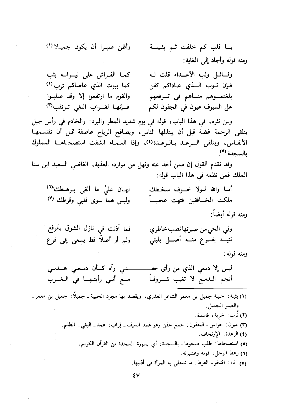 1 بثينة: حبيبة جميل بن معمر الشاعر العذري، ويقصد بها مجرد الحبيبة، جميلًا: جميل بن معمر، والصبر الجميل.