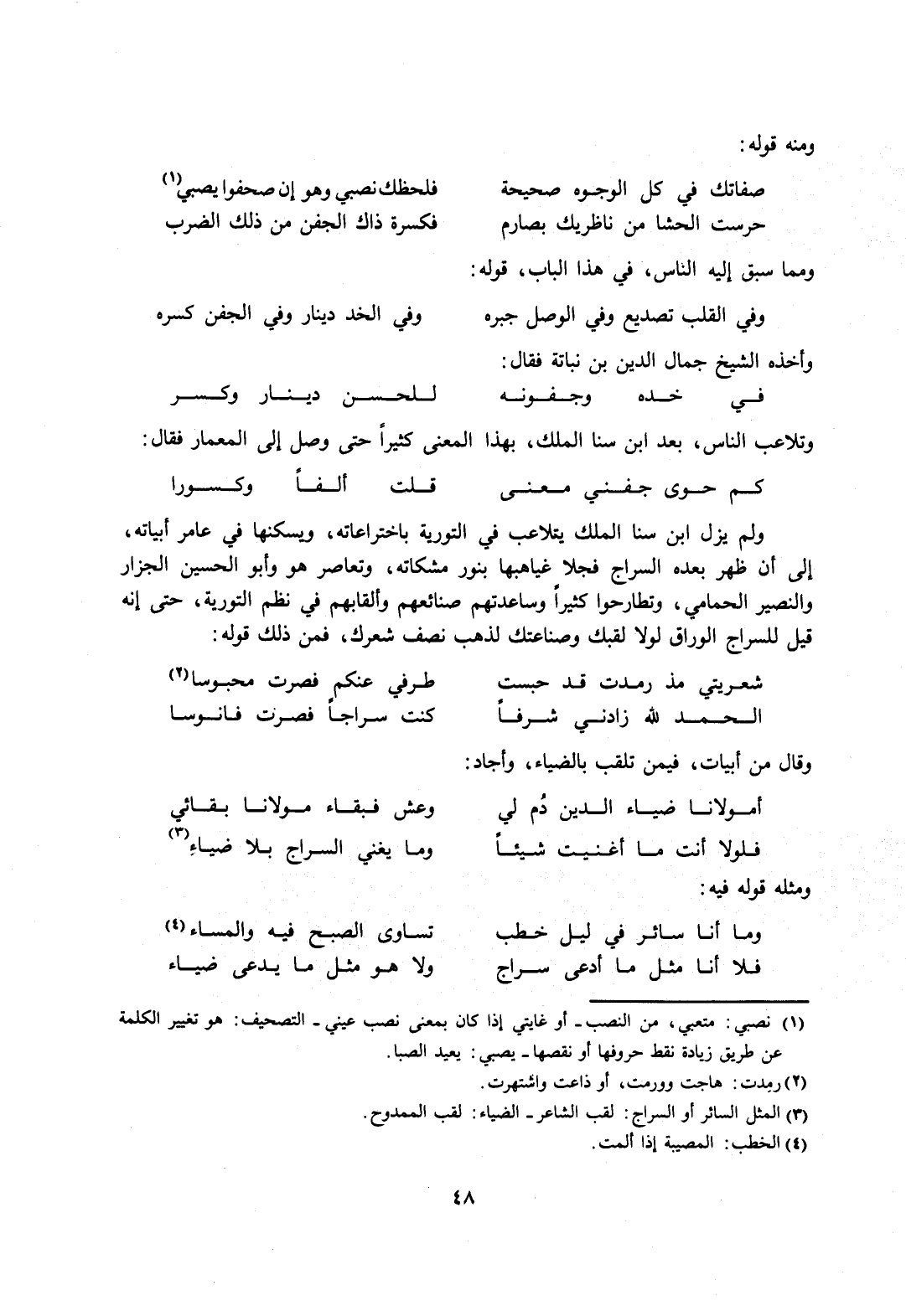 ولم يزل ابن سنا الملك يتلاعب في التورية باختراعاته، ويسكنها في عامر أبياته، إلى أن ظهر بعده السراج فجلا غياهبها بنور مشكاته، وتعاصر هو وأبو الحسين الجزار والنصير الحمامي، وتطارحوا كثيرًا وساعدتهم صنائعهم وألقابهم في نظم التورية، حتى إنه قيل للسراج الوراق لولا لقبك وصناعتك لذهب نصف شعرك، فمن ذلك قوله: