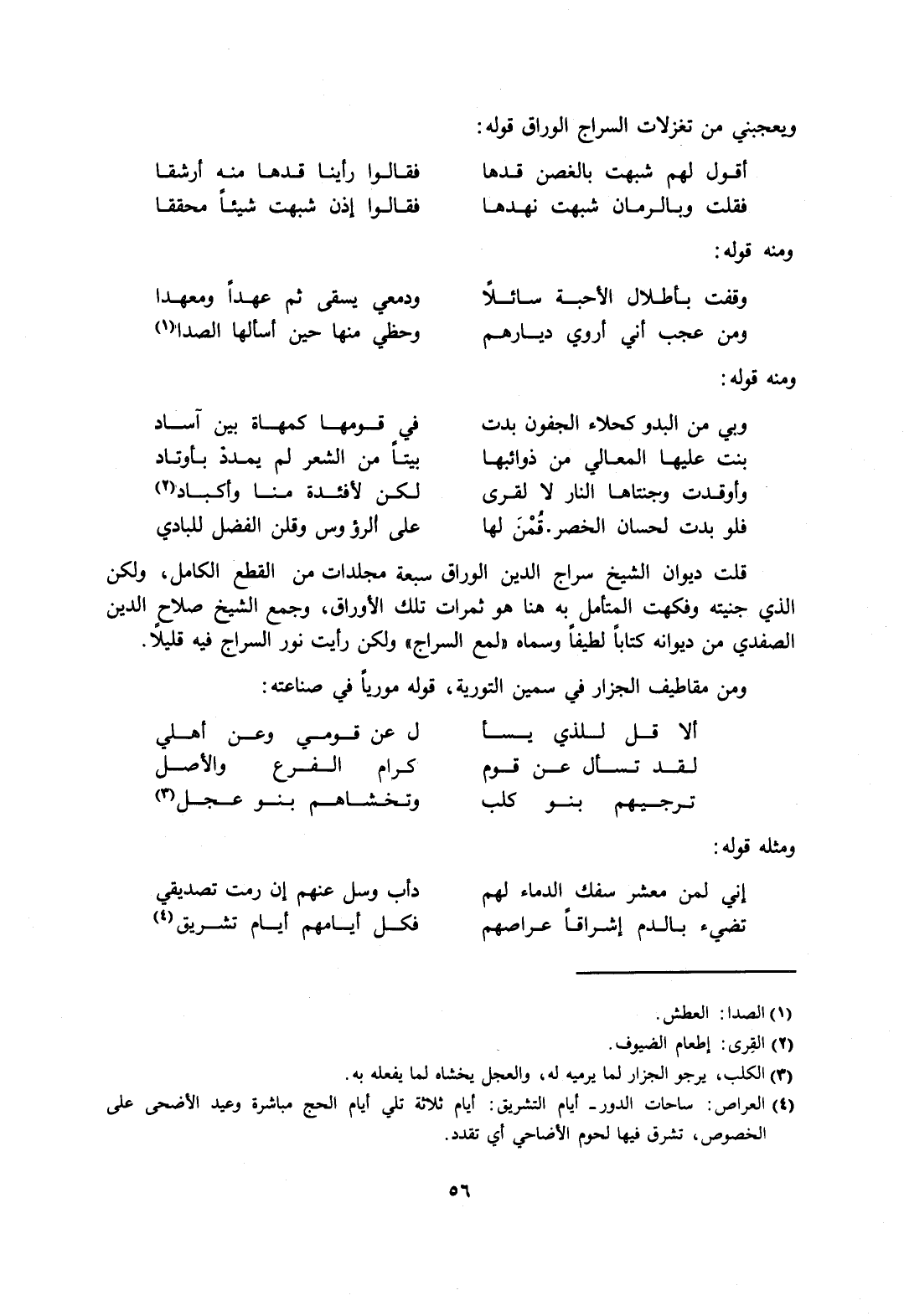 قلت ديوان الشيخ سراج الدين الوراق سبعة مجلدات من القطع الكامل، ولكن الذي جنيته وفكهت المتأمل به هنا هو ثمرات تلك الأوراق، وجمع الشيخ صلاح الدين الصفدي من ديوانه كتابًا لطيفًا وسماه: "لمع السراج" ولكن رأيت نور السراج فيه قليلًا.
