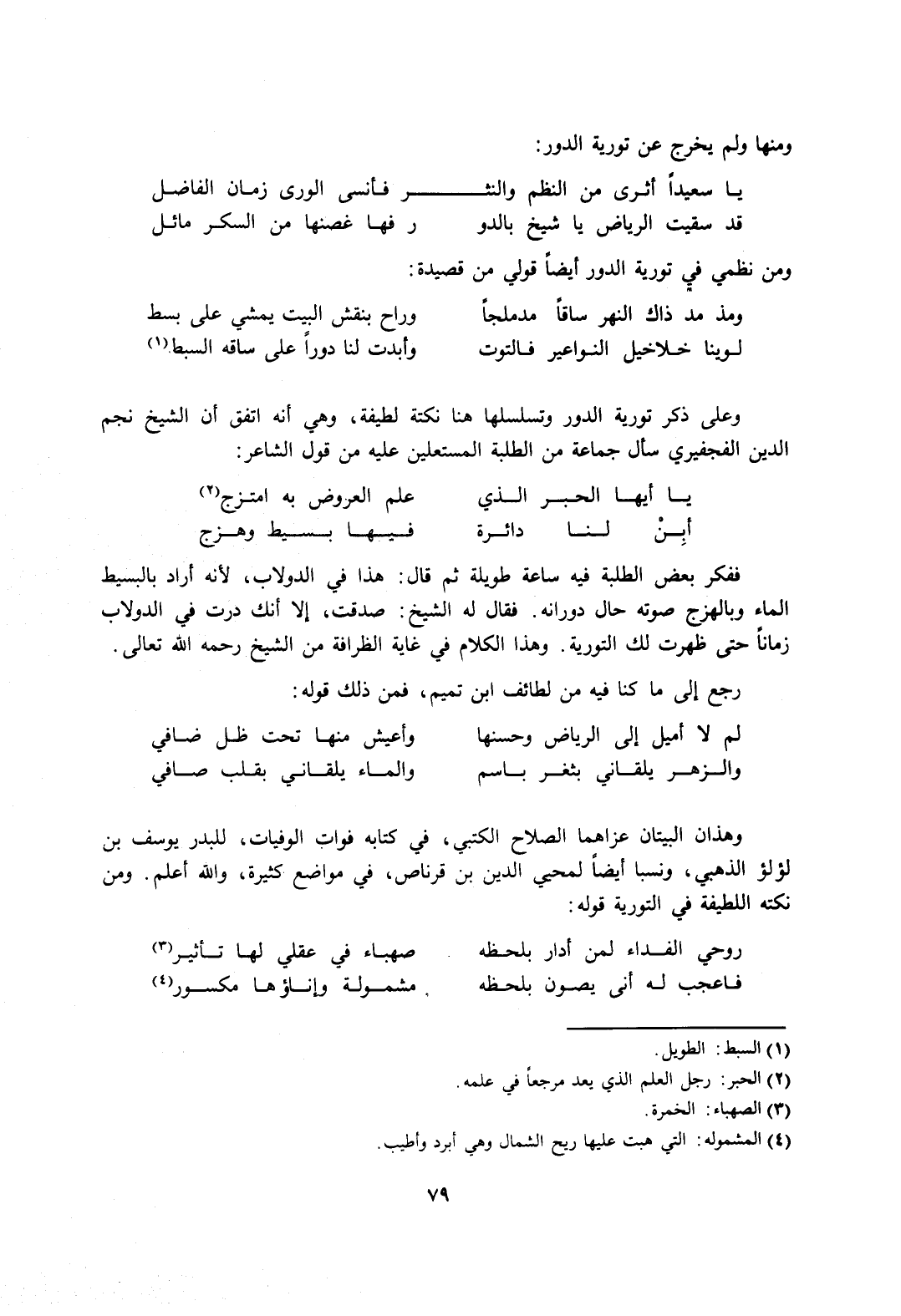 وعلى ذكر تورية الدور وتسلسلها هنا نكتة لطيفة، وهي أنه اتفق أن الشيخ نجم الدين الفجفيري سأل جماعة من الطلبة المستعلين عليه من قول الشاعر: