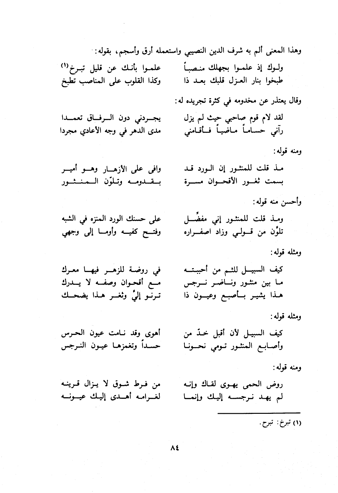 وهذا المعنى أَلَمّ به شرف الدين النصيبي واستعمله أرق وأسجم، بقوله: