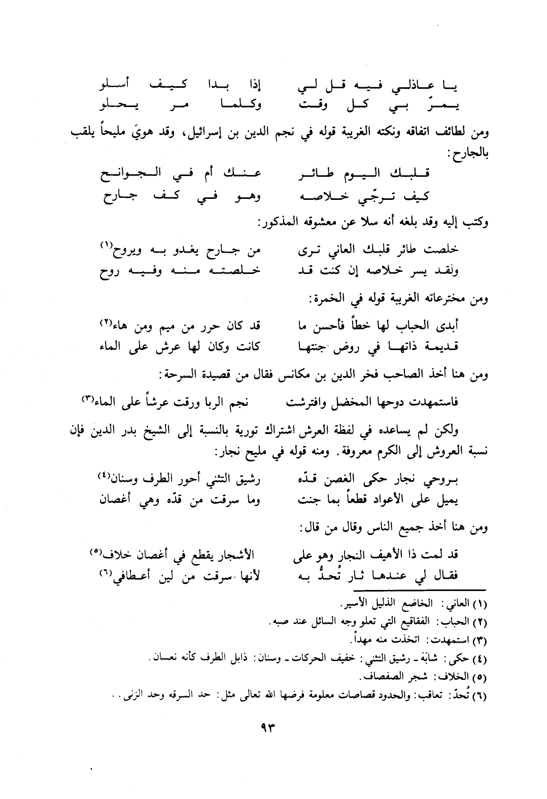 ومن لطائف اتفاقه ونكته الغريبة قوله في نجم الدين بن اسرائيل، وقد هويَ مليحًا يلقب بالجارح: