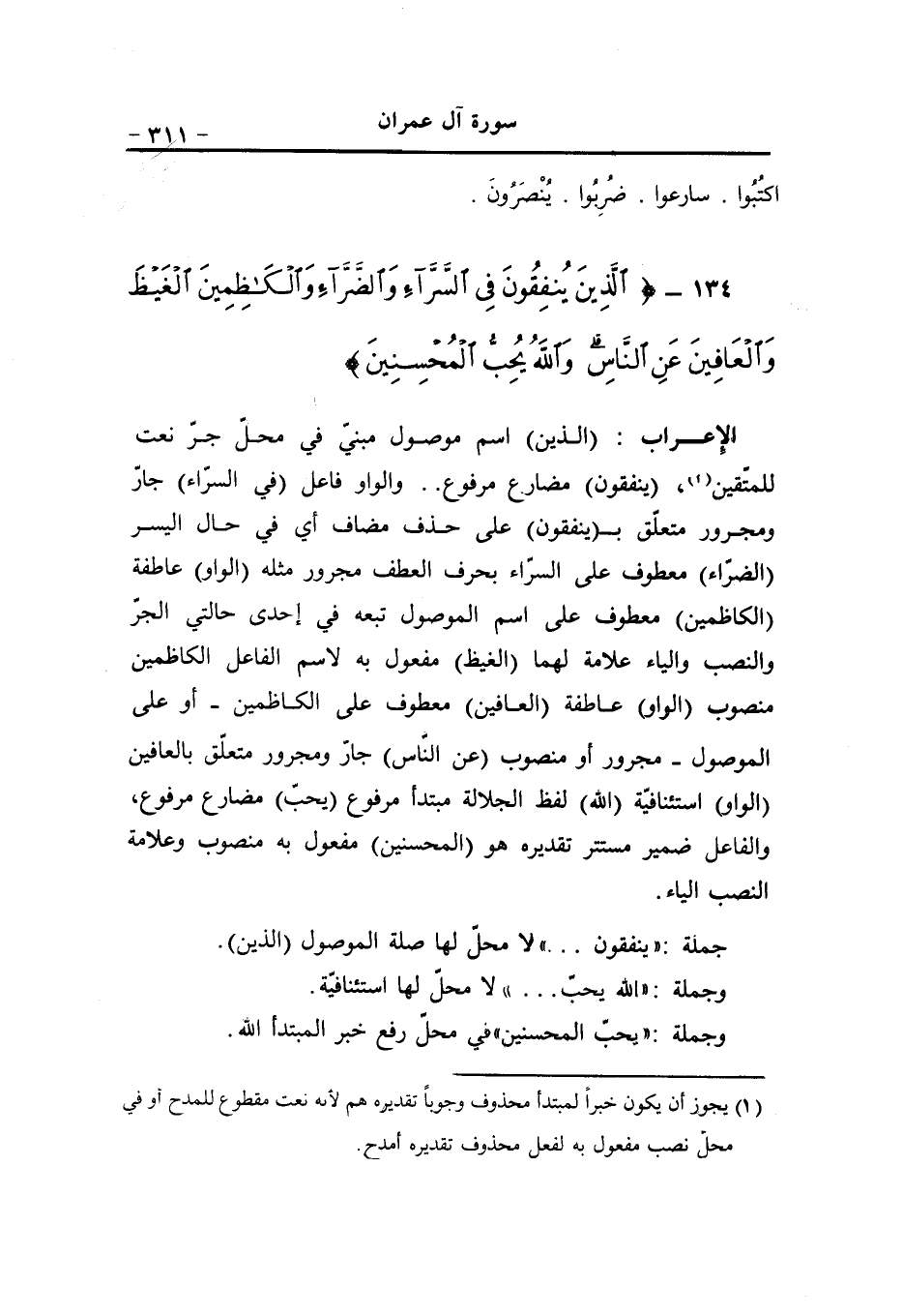 (سبيل) ، اسم بمعنى الطريق يذكّر ويؤنّث، وزنه فعيل مشتقّ من سبّل الرباعيّ، جمعه سبل بضمتين أو ضمّ فسكون وأسبل بفتح الهمزة وضمّ الباء وأسبلة بفتح الهمزة وكسر الباء، وسبول بضمّ السين (الآية 108) (أحياء) ، جمع حيّ، صفة مشبّهة من حيي يحيا باب فرح وزنه فعل بفتح فسكون وعينه ولامه من حرف واحد، وأحياء فيه إبدال حرف العلة- وهو لام الكلمة- همزة لمجيء الياء متطرفة بعد ألف ساكنة وأصله أحياي.