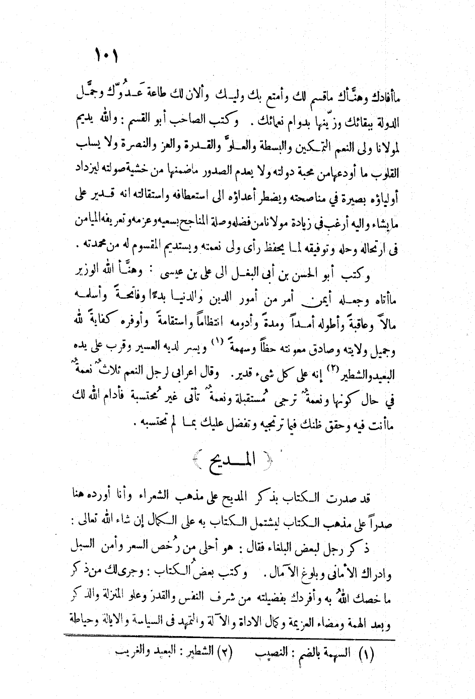 قد صدرت الكتاب بذكر المديح على مذهب الشعراء وأنا أورده هنا صدراً على مذهب الكتاب ليشتمل الكتاب به على الكمال إن شاء الله تعالى. ذكر رجل لبعض البلغاء فقال: هو أحلى من رخص السعر وأمن السبل وإدراك الأماني وبلوغ الآمال. وكتب بعضُ الكتاب: وجرى لك من ذكر ما خصك الله به وأفردك بفضيلته من شرف النفس والقدر وعلو المنزلة والذكر وبعد الهمة ومضاء العزيمة وكمال الأداة والآلة والتمهد في السياسة والأيالة وحياطة