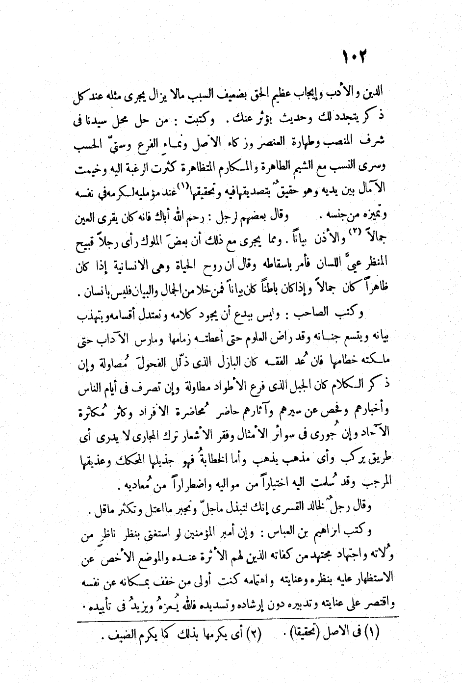 الدين والأدب وإيجاب عظيم الحق بضعيف السبب مالا يزال يجري مثله عند كل ذكر يتجدد لك وحديث يؤثر عنك. وكتبت: من حل محل سيدنا في شرف المنصب وطهارة العنصر وزكاء الأصل ونماءٍ الفرع وستي الحسب وسري النسب مع الشيم الطاهرة والمكارم المتظاهرة كثرت الرغبة إليه وخيمت الآمال بين يديه وهو حقيقٌ بتصديقها فيه وتحقيقها عند مؤمليه لكرمه في نفسه وتميزه من جنسه. وقال بعضهم لرجل: رحم الله أباك فإنه كان يقري العين جمالاً والأذن بياناً. ومما يجري مع ذلك أن بعضَ الملوك رأى رجلاً قبيح المنظر عي اللسان فأمر بإسقاطه وقال إن روح الحياة وهي الإنسانية إذا كان ظاهراً كان جمالاً وإذا كان باطناً كان بياتا فمن خلا من الجمال والبيان فليس بإنسان. وكتب الصاحب: وليس ببدع أن يجود كلامه وتعتدل أقسامه ويتهذب بيانه ويتسع جنانه وقد راض العلوم حتى أعطته زمامها ومارس الآداب حتى ملكته خطامها فإن عُد الفقه كان البازل الذي ذلل الفحولَ مصاولة وإن ذكر الكلام كان الجبل الذي فرع الأطواد مطاولة وإن تصرف في أيام الناس وأخبارهم وفحص عن سيرهم وآثارهم حاضر محاضرة الأفراد وكاثر مكاثرة الآحاد وإن جوري في سوائر الأمثال وفقر الأشعار ترك المجاري لا يدري أي طريق يركب وأي مذهب يذهب وأما الخطابة فهو جذيلها المككك وعذيقها المرجب وقد سُلمت إليه مذهب يذهب وأما الخطابة فهو جذيلها المحكك وعذيقها المرجب وقد سلمت إليه إختياراً من مواليه واضطراراً من معاديه. وقال رجلٌ لخالد القسري إنك لتبذل ما جل وتجبر ما اعتل وتكثر ما قل. وكتب إبراهيم بن العباس: وإن أمير المؤمنين لو استغنى بنظر ناظرٍ من ولاته واجتهاد مجتهد من كفاته الذين لهم الأثرة عنده والموضع الأخص عن الاستظهار عليه بنظره وعنايته واهتمامه كنت أولى من خفف بمكانه عن نفسه واقتصر على عنايته وتدبيره دون إرشاده وتسديده فالله يعزهُ ويزيد في تأييده.