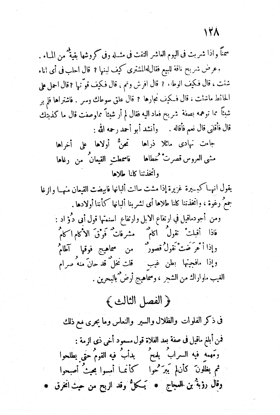 سمناً وإذا شربت في اليوم العاشر التقت في مثله وفي كروشها بقيةٌ الماء. وعرض شريح ناقة للبيع فقال له المشتري كيف لبنها؟ قال احلب في أي إناء شئت، قال فكيف الوطء؟ قال أفرش ونم، قال كيف قوتها؟ قال احمل على الحائط ما شئت، قال فكيف نجارها؟ قال علق سوطك وسر. فاشتراها فلم ير شيئاً مما توهمه بصفة شريح فعاد إليه فقال لم أر شيئاً مما وصفت قال ما كذبتك قال فأقلني قال نعم فأقاله. وأنشد أبو أحمد رحمه الله: