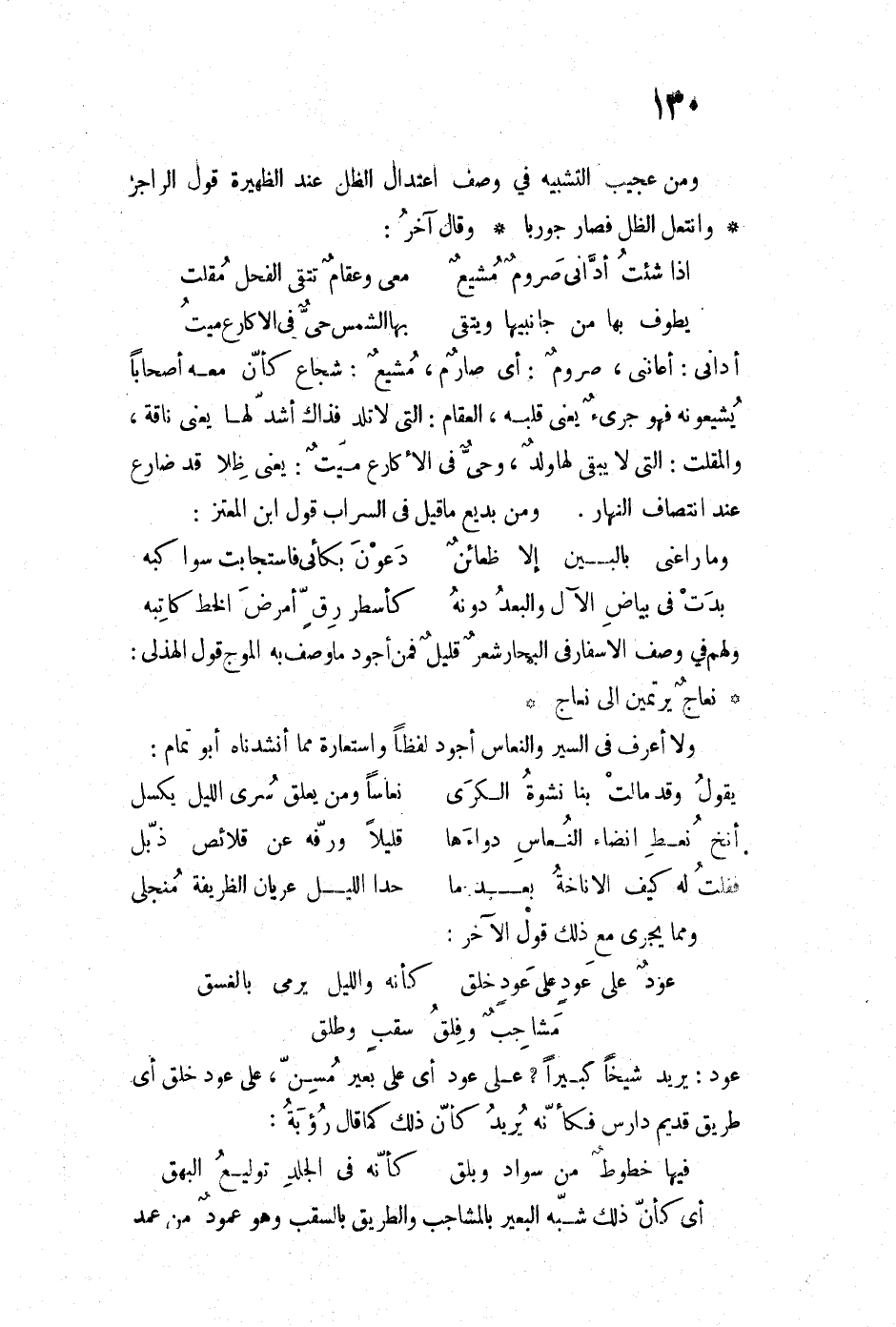 أداني: أعاني، صرومٌ: أي صارمٌ، مشيعٌ: شجاع كأن معه أصحاباً يشيعونه فهو جرئ يعني قلبه، العقام: التي لا تلد فذاك أشد لها يعني ناقة، والمقلت: التي لا يبقى لها ولدٌ، وحيٌ في الأكارع ميتٌ: يعني ظلا قد ضارع عند انتصاف النهار. ومن بديع ما قيل في السراب قول ابن المعتز: