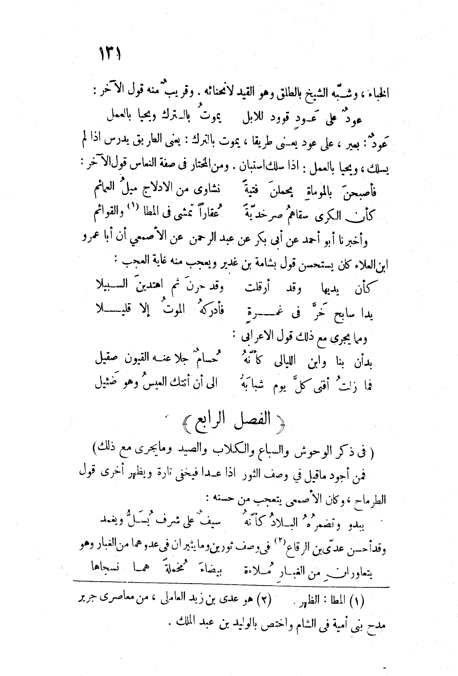 (في ذكر الوحوش والسباع والكلاب والصيد وما يجري مع ذلك) فمن أجود ما قيل في وصف الثور إذا عدا فيخفى تارة ويظهر أخرى قول الطرماح، وكان الأصمعي يتعجب من حسنه: