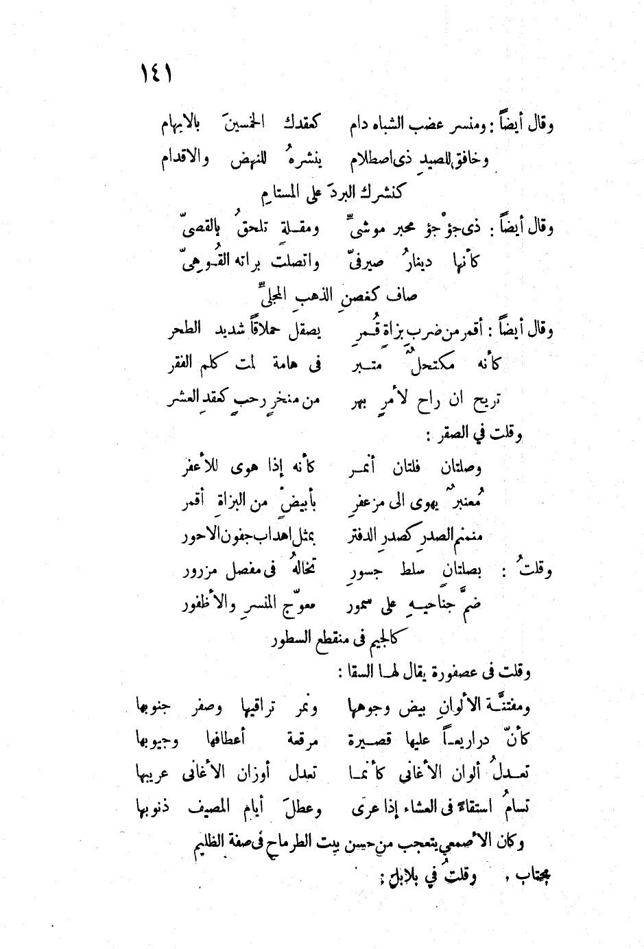 وكان الأصمعي يتعجب من حسن بيت الطرماح في صفة الظليم مجتاب. وقلت في بلابل: