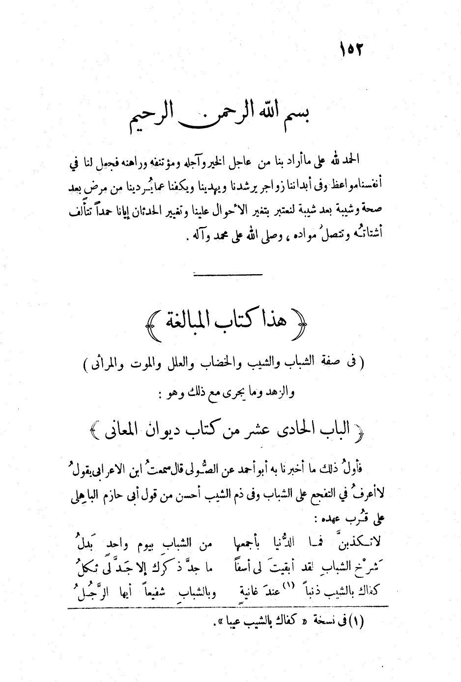 بسم الله الرحمن الرحيم الحمد لله على ما أراد بنا من عاجل الخير وآجله ومؤتنفه وراهنه فجعل لنا في أنفسنا مواعظ وفي أبداننا زواجر يرشدنا ويهدينا ويكفنا عما يردينا من مرض بعد صحة وشيبة بعد شيبة لنعتبر بتغير الأحوال علينا وتغير الحدثان إيانا حمداً تتألف أشتاتهُ وتتصل مواده وصلى الله على محمد وآله.