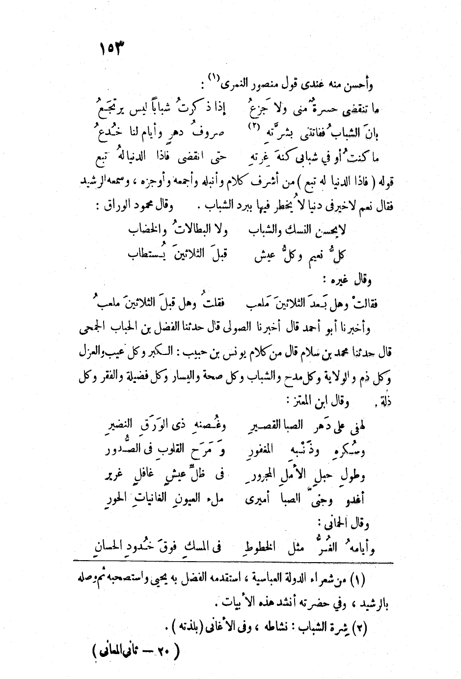 من أشرف كلام وأنبله وأجمعه وأوجزه، وسمعه الرشيد فقال نعم لا خير في دنيا لا يخطر فيها ببرد الشباب. وقال محمود الوراق: