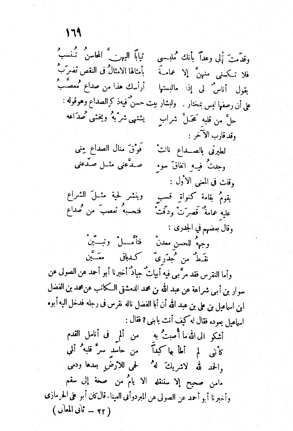 وأما النقرس فقد مربي فيه أبياتٌ جيادٌ أخبرنا أبو أحمد عن الصولي عن سوار بن أبي شراعة عن عبد الله بن محمد الدمشقي الكاتب عن محمد بن الفضل ابن إسماعيل بن علي بن عبد الله أن أبا الفضل ناله نقرس في رجله فدخل إليه أبوه إسماعيل يعوده فقال له كيف أنت يا بني؟ فقال: