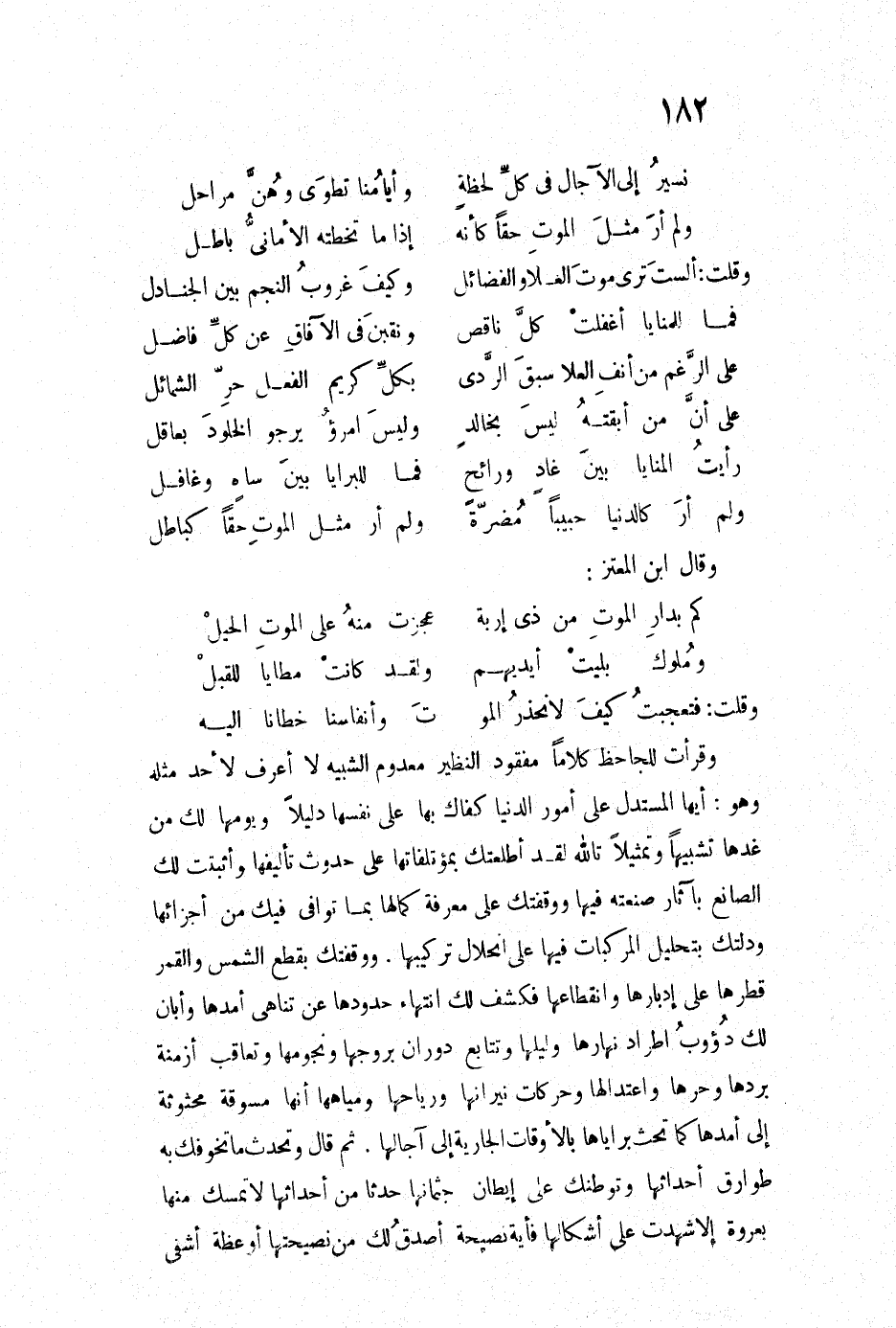 وقرأت للجاحظ كلاماً مفقود النظير معدوم الشبيه لا أعرف لأحد مثله وهو: أيها المستدل على أمور الدنيا كفاك بها على نفسها دليلاً ويومها لك من غدها تشبيهاً وتمثيلاً تالله لقد أطلعتك بمؤتلفاتها على حدوث تأليفها وأثبتت لك الصانع بآثار صنعته فيها ووقفتك على معرفة كمالها بما توافى فيك من أجزائها ودلتك بتحليل المركبات فيها على انحلال تركيبها. ووقفتك بقطع الشمس والقمر قطرها على إدبارها وانقطاعها فكشف لك انتهاء حدودها عن تناهي أمدها وأبان لك دؤوب اطراد نهارها وليلها وتتابع دوران بروجها ونجومها وتعاقب أزمنة بردها وحرها واعتدالها وحركات نيرانها ورياحها ومياهها أنه مسوقة محثوثة إلى أمدها كما تحث براياها بالأوقات الجارية إلى آجالها. ثم قال وتحدث ما تخوفك به طوارق أحداثها وتوطنك على إيطان جثمانها حدثاً من أحداثها لا تمسك منها بعروة إلا شهدت على أشكالها فأية نصيحة أصدق لك من نصيحتها أوعظة أشفى