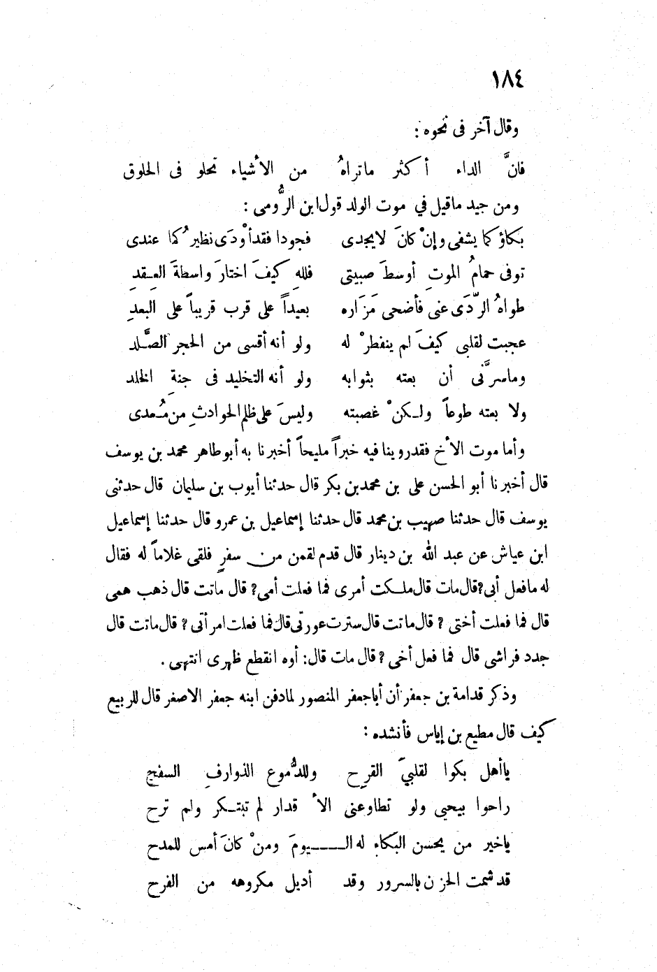وأما موت الأخ فقد روينا فيه خبراً مليحاً أخبرنا به أبو طاهر محمد بن يوسف قال أخبرنا أبو الحسن علي بن محمد بن بكر قال حدثنا أيوب بن سليمان قال حدثني يوسف قال حدثنا صهيب بن محمد قال حدثنا إسماعيل بن عمرو قال حدثنا إسماعيل ابن عياش عن عبد الله بن دينار قال قدم لقمان من سفرٍ فلقى غلاماً له فقال له فعل أبي؟ قال مات قال ملكت أمري فما فعلت أمي؟ قال ماتت قال ذهب همي قال فما فعلت أختي؟ قال ماتت قال سترت عورتي قال فما فعلت امرأتي؟ قال ماتت قال جدد فراشي قال فما فعل أخي؟ قال مات قال: أوه انقطع ظهري انتهى. وذكر قدامة بن جعفر أن أبا جعفر المنصور لمادفن ابنه جعفر الأصغر قال للربيع كيف قال مطيع بن إياس فأنشده: