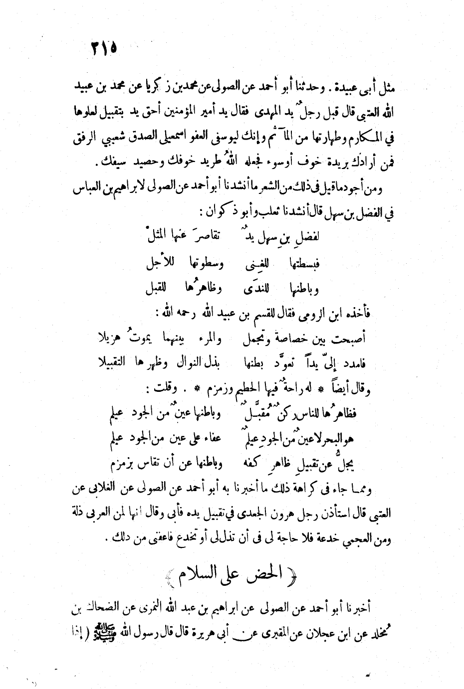 مثل أبي عبيدة. وحدثنا أبو أحمد عن الصولي عن محمد بن زكريا عن محمد بن عبيد الله العتبي قال قبل رجلٌ يد المهدي فقال يد أمير المؤمنين أحق يد بتقبيل لعلوها في المكارم وطهرتها من الماء ثم وأنك ليوسفي العفو إسمعيلي الصدق شعبي الرفق فمن أرادك بريدة خوف أو سوء فجعله الله طريد خوفك وحصيدة سيفك. ومن أجود ما قيل في ذلك من الشعر ما أنشدنا أبو أحمد عن الصولي لإبراهيم بن العباس في الفضل بن سهل قال أنشدنا ثعلب وأبو ذكوان: