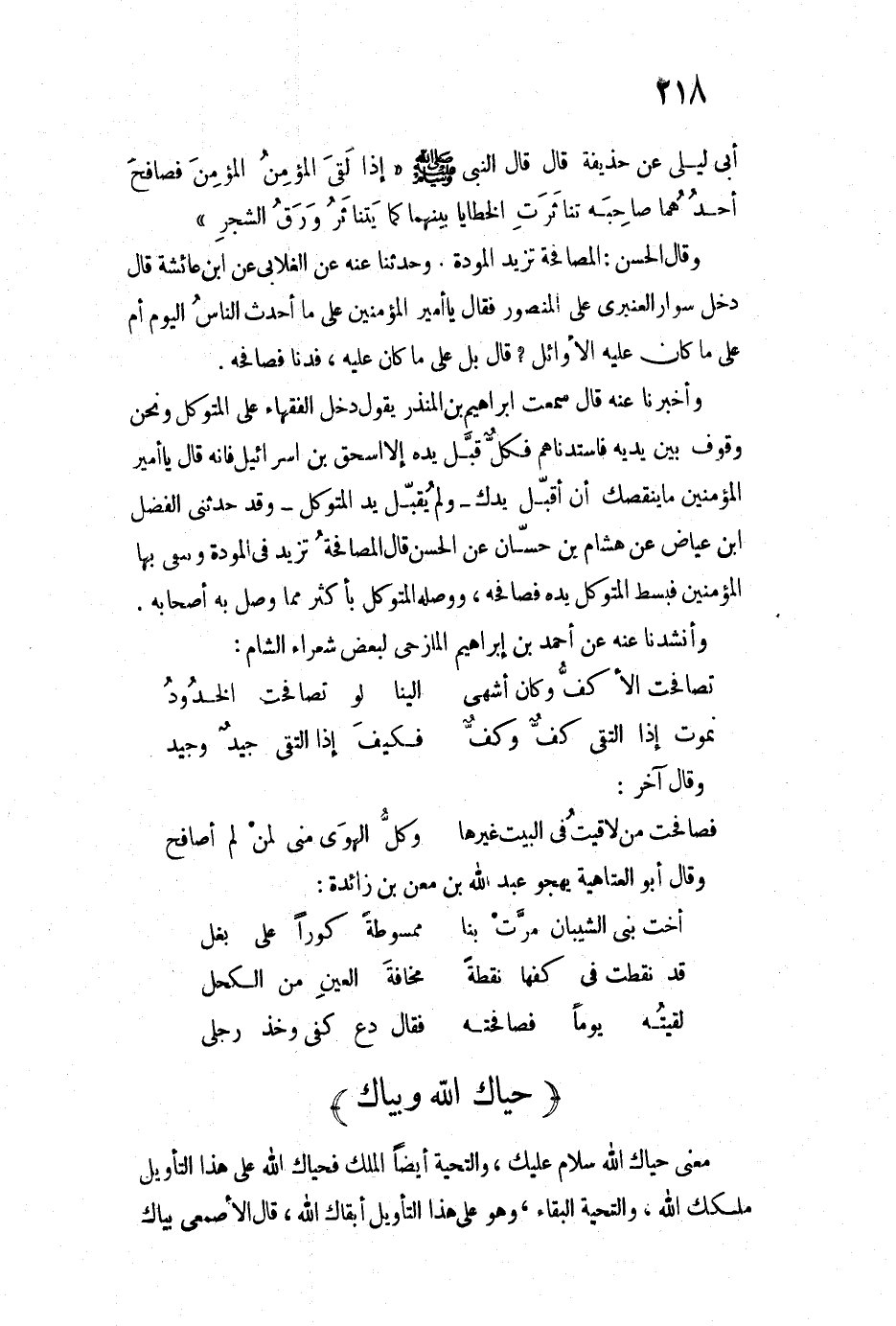 أبي ليلى عن حذيفة قال قال النبي & (إذا لقي المؤمن المؤمن فصافح أحدهما صاحبه تناثرت الخطايا بينهما كما يتناثر ورق الشجر) . وقال الحسن: المصافحة تزيد المودة. وحدثنا عنه عن الغلابي عن ابن عائشة قال دخل سوار العنبري على المنصور فقال يا أمير المؤمنين على ما أحدث الناسُ اليوم أم على ما كان عليه الأوائل؟ قال بل على ما كان عليه، فدنا فصافحه. وأخبرنا عنه قال سمعت إبراهيم بن المنذر يقول دخل الفقهاء على المتوكل ونحن وقوف بين يديه فاستدناهم فكلٌ قبل يده إلا إسحاق بن إسرائيل فإنه قال يا أمير الؤمنين ما ينقصك أن أقبل يدك ولم يقبل يد المتوكل وقد حدثني الفضل ابن عياض عن هشام بن حسان عن الحسن قال المصافحة تزيد في المودة ويبقى بها المؤمنين فبسط المتوكل يده فصافحه، وصله المتوكل بأكثر مما وصل به أصحابه. وأنشدنا عنه عن أحمد بن إبراهيم المازحي لبعض شعراء الشام: