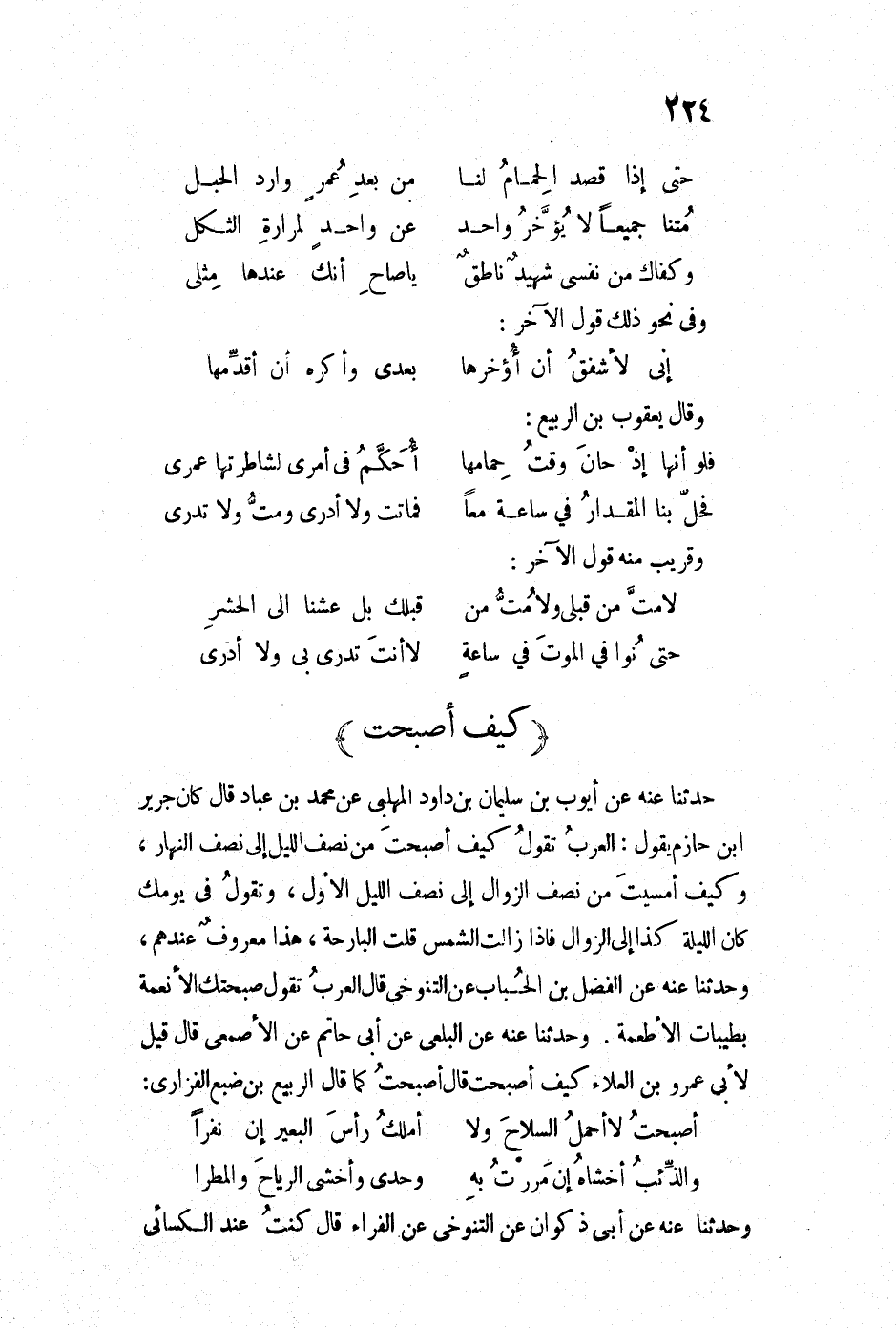 حدثنا عنه عن أيوب بن سليمان بن داود المهلبي عن محمد بن عباد قال كان جرير ابن حازم يقول: العربُ تقول كيف أصبحت من نصف الليل إلى نصف النهار وكيف أمسيتَ من نصف الزوال إلى نصف الليل الأول، وتقول في يومك كان الليلة كذا إلى الزوال فإذا زالت الشمس قلت البارحة، هذا معروفٌ عندهم، وحدثنا عنه عن الفضل بن الحباب عن التنوخي قال العرب تقول صبحتك الأنعمة بطينات الأطعمة وحدثنا عنه عن البلعي عن أبي حاتم عن الأصمعي قال قيل لأبي عمرو بن العلاء كيف أصبحت قال أصبحت كما قال الربيع بن ضبع الفزاري: