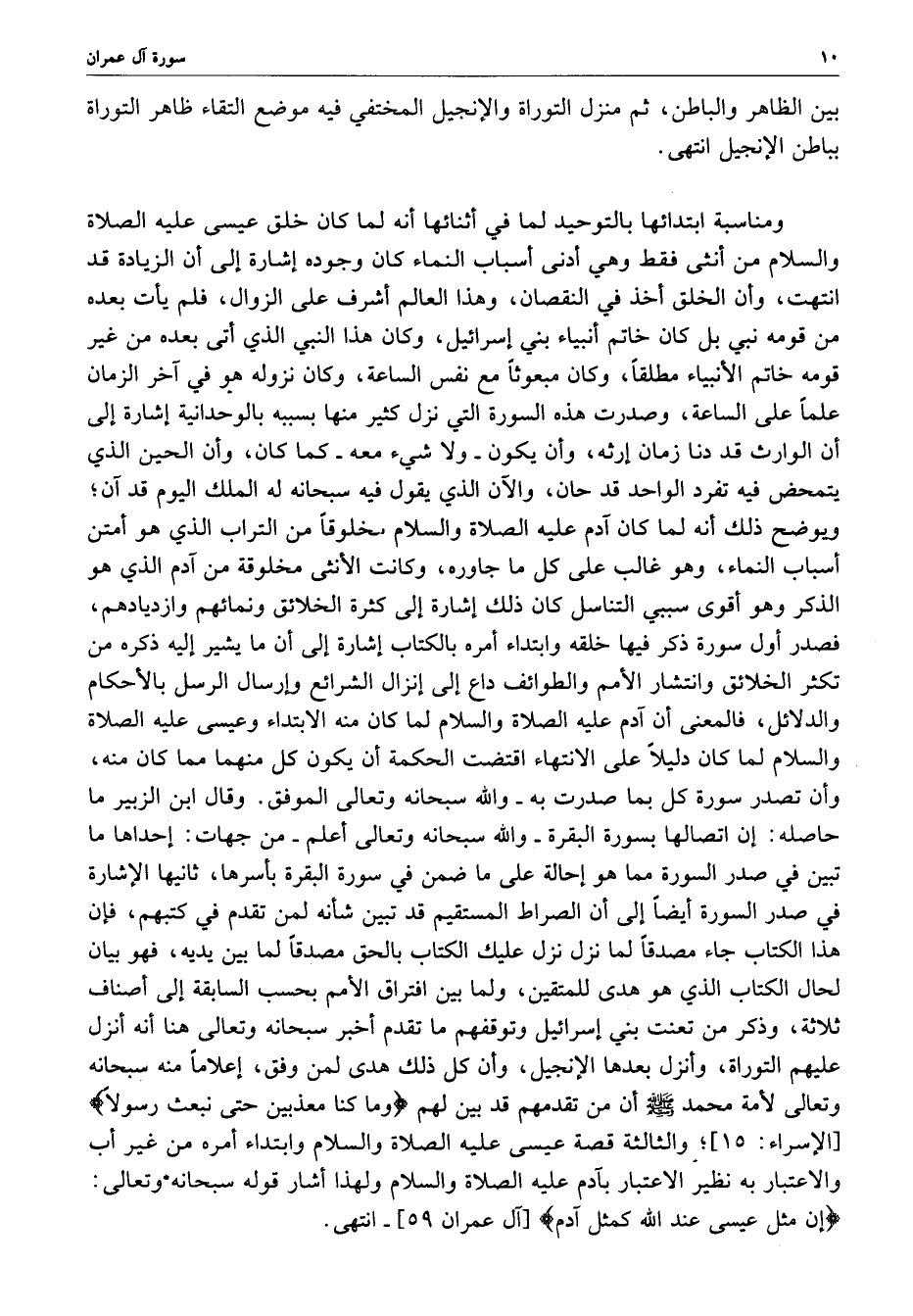 وقال ابن الزبير ما حاصله : إن اتصالها بسورة البقرة والله سبحانه وتعالى أعلم من جهات : إحداها ما تبين في صدر السورة مما هو إحالة على ما ضمن في سورة البقرة بأسرها ، ثانيها الإشارة في صدر السورة أيضاً إلى أن الصراط المستقيم قد تبين شأنه لمن تقدم في كتبهم ، فإن هذا الكتاب جاء مصدقاً لما نزل نزل عليك الكتاب بالحق مصدقاً لما بين يديه ، فهو بيان لحال الكتاب الذي هو هدى للمتقين ، ولما بين افتراق الأمم بحسب السابقة إلى أصناف ثلاثة ، وذكر من تعنت بني إسرائيل وتوقفهم ما تقدم أخبر سبحانه وتعالى هنا أنه أنزل عليهم التوراة ، وأنزل بعدها الإنجيل ، وأن كل ذلك هدى لمن وفق ، إعلاماً منه سبحانه وتعالى لأمه محمد أن من تقدمهم قد بين لهم