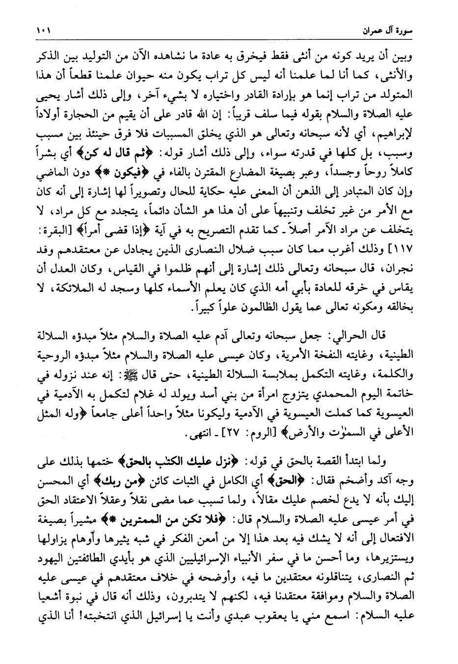 [ البقرة : 117 ] وذلك أغرب مما كان سبب ضلال النصارى الذين يجادل عن معتقدهم وفد نجران ، قال سبحانه وتعالى ذلك إشارة إلى أنهم ظلموا في القياس ، وكان العدل أن يقاس في خرقه للعادة بأبي أنه الذي كان يعلم الأسماء كلها وسجد له الملائكة ، لا بخالقه ومكونه تعالى عما يقول الظالمون علواً كبيراً .