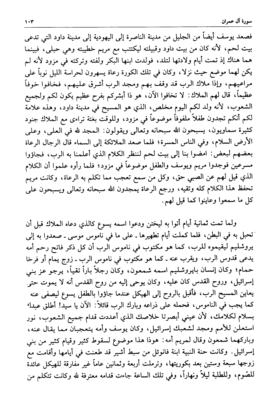 ولما تمت ثمانية أيام أتوا به ليختن ودعوا اسمه يسوع كالذي دعاه الملاك قبل أن تحبل به في البطن ، فلما كملت أيام تطهيرها - على ما في ناموس موسى - صعدوا به إلى يروشليم ليقيموه للرب ، كما هو مكتوب في ناموس ا يدعى قدوس الرب ، ويقرب عنه - كما هو مكتوب في ناموس الرب - زوج يمام أو فرخا حمام ؛ وكان إنسان بايروشليم اسمه شمعون ، وكان رجلاً باراً تقياً ، يرجو عز بني إسرائل ، وروح القدس كان عليه ، وكان يوحى إليه من روح القدس أنه لا يموت حتى يعاين المسيح الرب ، فأقبل بالروح إلى الهيكل عندما جاؤوا بالطفل يسوع ليصفى عنه كما يجب في الناموس ، فحمله على ذراعه وبارك الرب قائلاً : الآن يا سيد أطلق عبدك بسلام لكلامك ، لأن عيني أبصرتك خلاصك الذي أعددت قدام جميع الشعوب ، نور استعلن للأمم ومجد لشعبك إسرائيل ، وكان يوسف وأمه يتعجبان مما يقال عنه ، وباركهما شمعون وقال لمريم أمه : هوذا هذا موضوع لسقوط كثير وقيام كثير من بني إسرائيل .