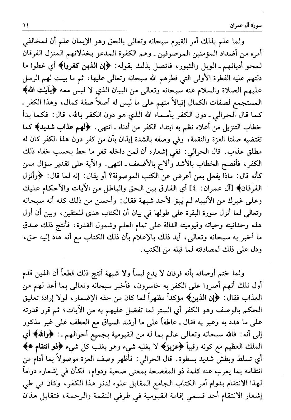 ولما ختم أوصافه بأنه فرقان لا يدع لبساً ولا شبهة أنتج ذلك قطعاً أن الذين قدم أول تلك أنهم أصروا على الكفر به خاسرون ، فأخبر سبحانه وتعالى بما أعد لهم من العذاب فقال : ( إن الذين ( مؤكداً مظهراً لما كان من حقه الإضمار ، لولا إرادة تعليق الحكم بالوصف وهو الكفر أي الستر لما تفضل عليهم به من الآيات ؛ ثم قرر قدرته على ما هدد به وعبر به فقال : عاطفاًعلى ما أرشد السياق مع العطف على غير مذكور إلى أنه : فالله سبحانه وتعالى عالم بما له من القيومية بجميع أحوالهم : ( والله ) أي الملك العظيم مع كونه رقيباً ) عزيز ( لا يغلبه شيء وهو يغلب كل شيء ) ذو انتقام ) أي تسلط وبطش شديد بسطوة .