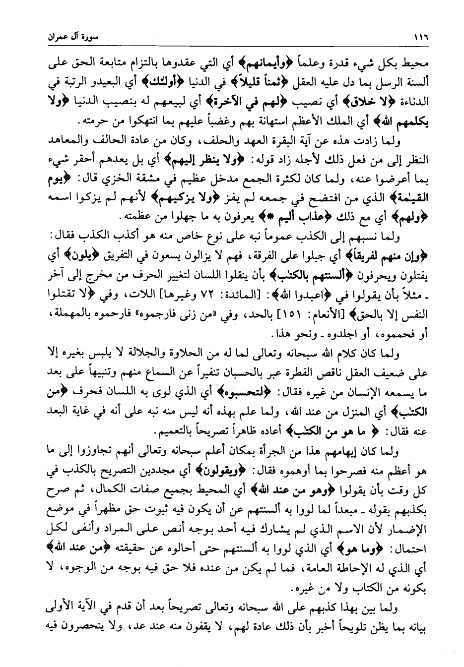 محيط بكل شيء قدرة وعلماً ) وأيمانهم ) أي التي عقدوها بالتزام متابعة الحق على ألسنة الرسل بما دل عليه العقل ) ثمناً قليلاً ( في الدنيا ) أولئك ) أي البعيدو الرتبة في الدناءة ) لا خلاق ) أي نصيب ) لهم في الآخرة ) أي لبيعهم له بنصيب الدنيا ) ولا يكلمهم الله ) أي الملك الأعظم استهانة بهم وغضباً عليهم بما انتهكوا من حرمته .