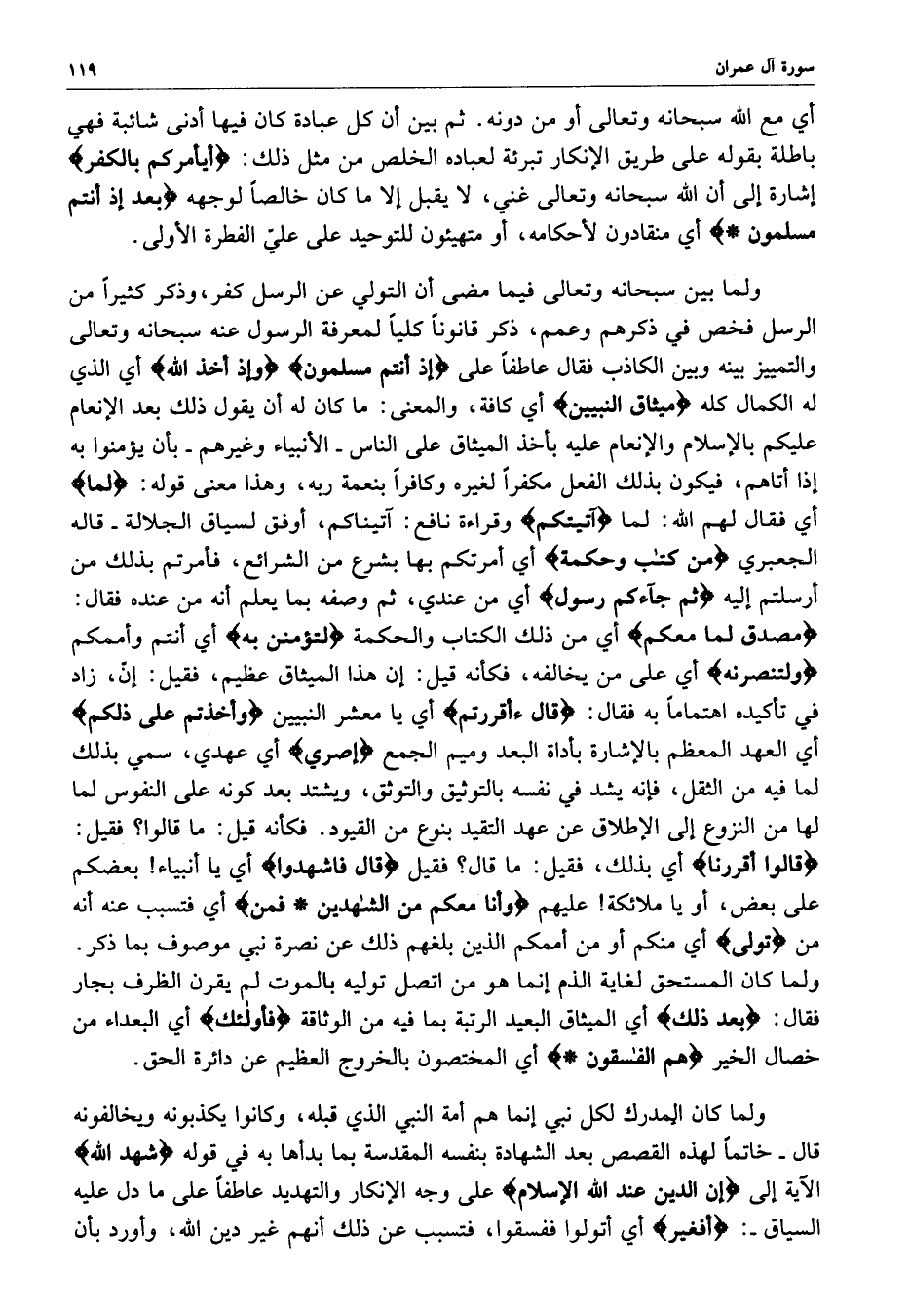 ولما بين سبحانه وتعالى فيما مضى أن التولي عن الرسل كفر ، وذكر كثيراً من الرسل فخص في ذكرهم وعمم ، ذكر قانوناً كلياً لمعرفة الرسول عنه سبحانه وتعالى والتمييز بينه وبين الكاذب فقال عاطفاً على ) إذ أنتم مسلمون ( ) وإذ أخذ الله ) أي الذي له الكمال كله ) ميثاق النبيين ) أي كافة ، والمعنى : ما كان له أن يقول ذلك بعد الإنعام عليكم بالإسلام والإنعام عليه بأخذ الميثاق على الناس - الأنبياء وغيرهم - بأن يؤمنوا به إذا اتهم ، فيكون بذلك الفعل مكفراً لغيره وكافراً بنعمة ربه ، وهذا معنى قوله : ( لما ) أي فقال لهم الله : لما ) آتيتكم ( وقراءة نافع : آتيناكم ، أوفق لسياق الجلالة - قاله الجعبري ) من كتاب وحكمة ) أي أمرتكم بها بشرع من الشرائع ، فأمرتم بذلك من أرسلتم إليه ) ثم جآءكم رسول ) أي من عندي ، ثم وصفه بما يعلم أنه من عنده فقال : ( مصدق لما معكم ) أي من ذلك الكتاب والحكمة ) لتؤمنن به ) أي أنتم وأممكم ) ولتنصرنه ) أي على من يخالفه ، فكأنه قيل : إن هذا الميثاق عظيم ، فقيل : إنّ ، زاد في تأكيده اهتماماً به فقال : ( قال ءأقررتم ) أي يا معشر النبيين ) وأخذتم على ذلكم ) أي العهد المعظم بالإشارة بأداة البعد وميم الجمع ) إصري ) أي عهدي ، سمي بذلك لما فيه من الثقل ، فإنه يشد في نفسه بالتوثيق والتوثق ، ويشتد بعد كونه على النفوس لما لها من النزوع إلى الإطلاق عن عهد التقيد بنوع من القيود ، فكأنه قيل : ما قالوا ؟ فقيل : ( قالوا أقررنا ) أي بذلك ، فقيل : ما قال ؟ فقيل ) قال فاشهدوا ) أي يا أنبياء بعضكم على بعض ، أو يا ملائكة عليهم ) وأنا معكم من الشاهدين فمن ) أي فتسبب عنه أنه من ) تولى ) أي منكم أو من أممكم الذي بلغهم ذلك عن نصرة نبي موصوف بما ذكر .