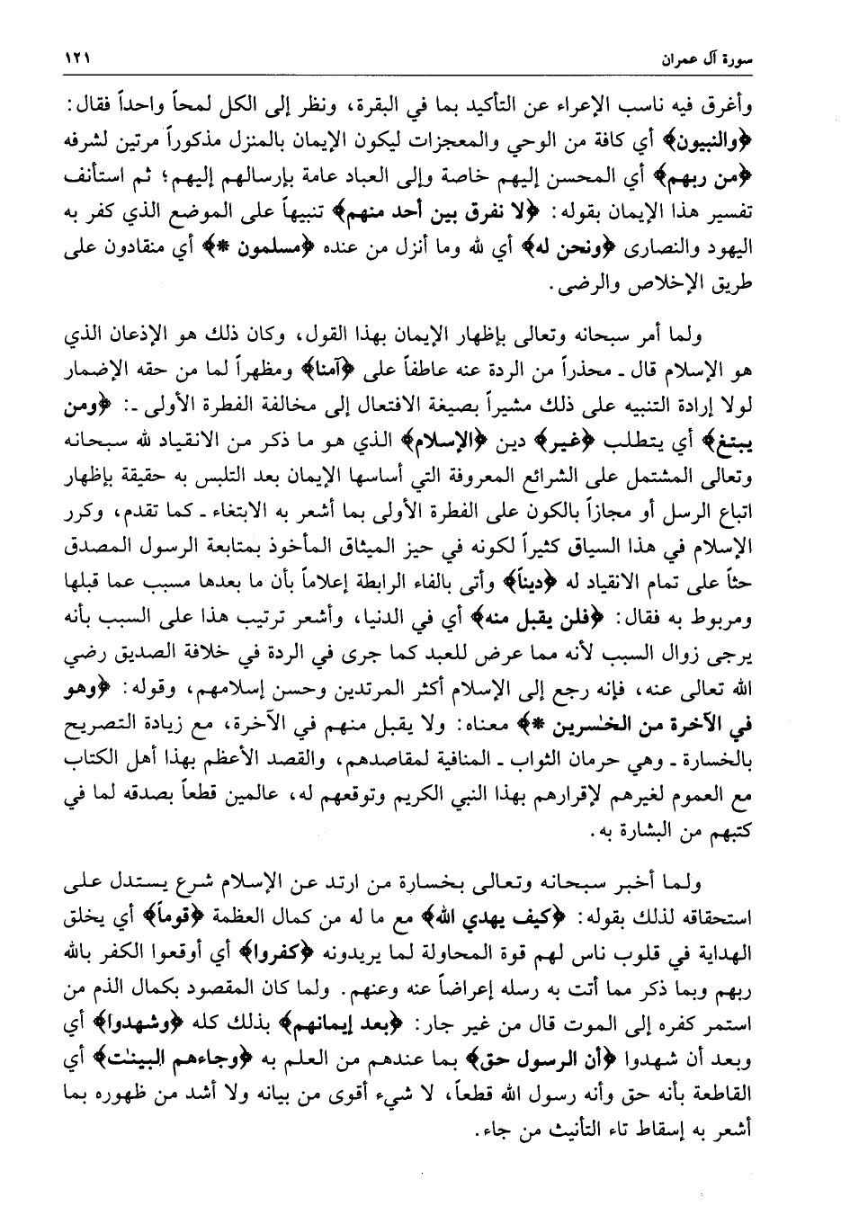وأغرق فيه ناسب الإإعراء عن التأكيد بما في البقرة ، ونظر إلى الكل لمحاً واحداً فقال : ( والنبيون ) أي كافة من الوحي والمعجزات ليكون الإيمان بالمنزل مذكوراً مرتين لشرفه ) من ربهم ) أي المحسن إليهم خاصة وإلى العباد عامة بإرسالهم إليهم ؛ ثم استأنف تفسير هذا الإيمان بقوله : ( لا نفرق بين أحد منهم ( تنبيهاً على الموضع الذي كفر به اليهود والنصارى ) ونحن له ) أي لله وما أنزل من عنده ) مسلمون ) أي منقادون على طريق الإخلاص والرضى .