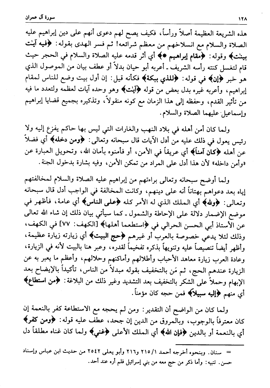 [ الكهف : 77 ] في الكهف ، وذلك لئلا يدعي خصوصة بالعرب أو غيرهم ) حج البيت ) أي زيارته زيارة عظيمة ، وأظهر أيضاً تنصيصاً عليه وتنويهاً بذكره تفخيماً لقدره ، وعبر هنا بالبيت لأنه في الزيارة ، وعادة العرب زيارة معاهد الأحباب وأطلالهم وأماكنهم وحلالهم ، وأعظم ما يعبر به عن الزيارة عندهم الحج ، ثم مَن بالتخفيف بقوله مبدلاً من الناس ، تأكيداً بالإيضاح بعد الإبهام وحملاً على الشكر بالتخفيف بعد التشديد وغير ذلك من البلاغة : ( من استطاع ) أي منهم ) إليه سبيلاً ( فمن حجه كان مؤمناً .