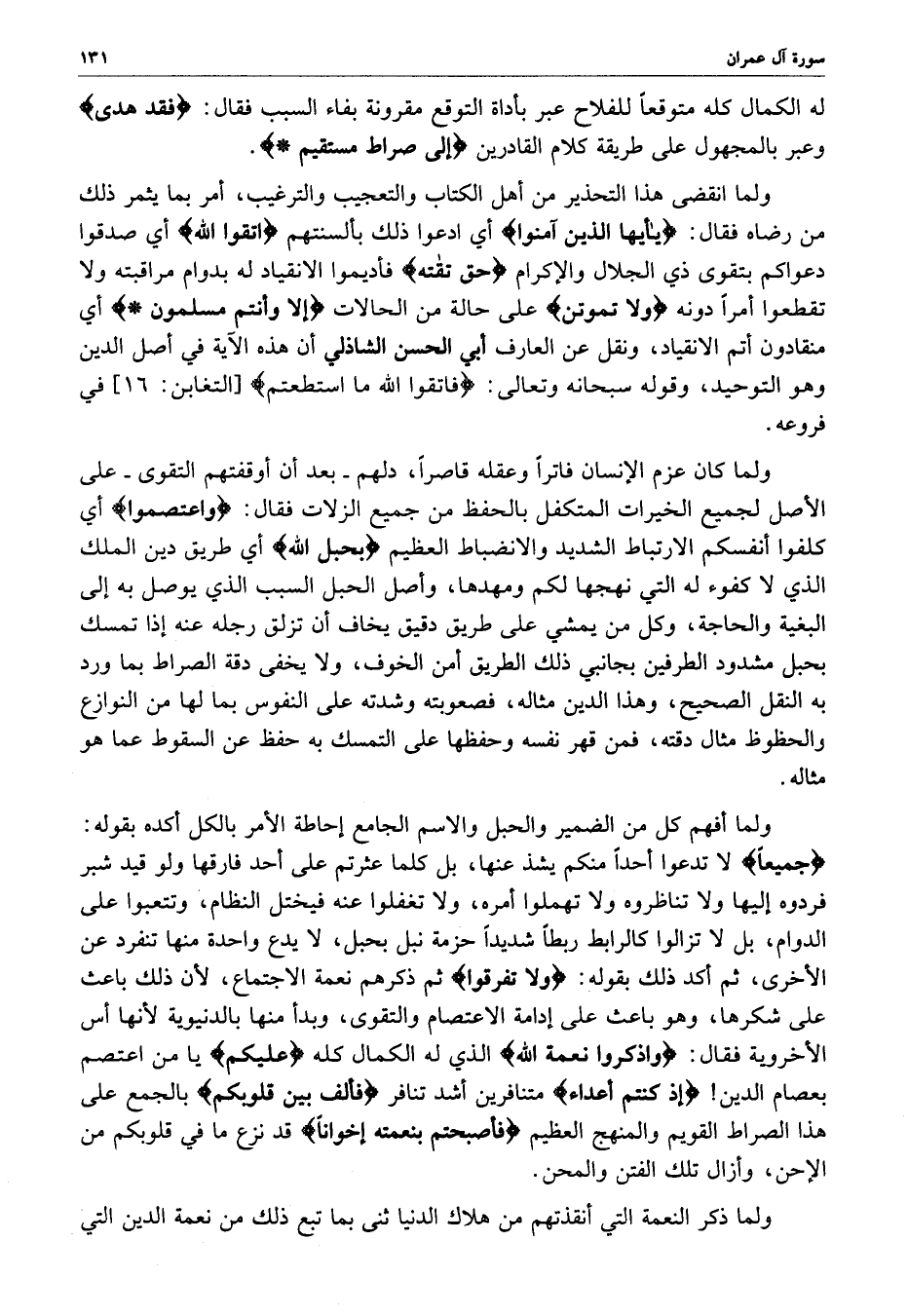 له الكمال كله متوقعاً للفلاح عبر بأداة التوقع مقرونة بفاء السبب فقال : ( فقد هدى ( وعبر بالمجهول على طريقة كلام القادرين ) إلى صراط مستقيم ( ولما انقضى هذا التحذير من أهل الكتاب والتعجيب والترغيب ، أمر بما يثمر ذلك من رضاه فقال : ( ياأيها الذين آمنوا ) أي ادعوا ذلك بألسنتهم ) اتقوا الله ) أي صدقوا دعواكم بتقوى ذي الجلال والإكرام ) جق تقاته ( فأديموا الانقياد له بدوام مراقبته ولا تقطعوا أمراً دونه ) ولا تموتن ( على حالة من الحالات ) إلا وأنتم مسلمون ) أي منقادون أتم الانقياد ، ونقل عن العارف أبي الحسن الشاذلي أن هذه الآية في اصل الدين وهو التوحيد ، وقوله سبحانه وتعالى :