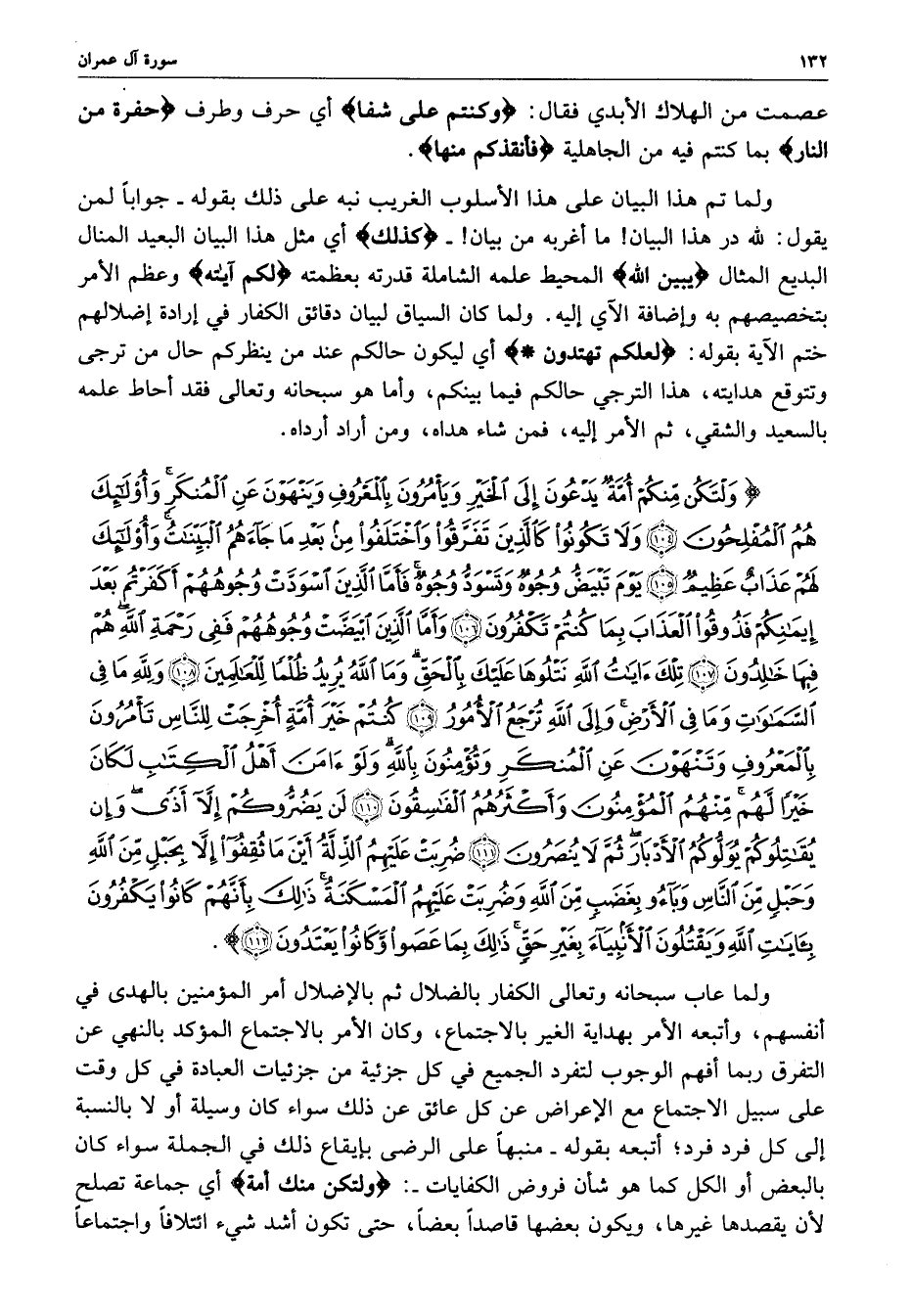 ) وَلْتَكُن مِّنْكُمْ أُمَّةٌ يَدْعُونَ إِلَى الْخَيْرِ وَيَأْمُرُونَ بِالْمَعْرُوفِ وَيَنْهَوْنَ عَنِ الْمُنْكَرِ وَأُوْلَئِكَ هُمُ الْمُفْلِحُونَ وَلاَ تَكُونُواْ كَالَّذِينَ تَفَرَّقُواْ وَاخْتَلَفُواْ مِن بَعْدِ مَا جَآءَهُمُ الْبَيِّنَاتُ وَأُوْلَئِكَ لَهُمْ عَذَابٌ عَظِيمٌ يَوْمَ تَبْيَضُّ وُجُوهٌ وَتَسْوَدُّ وُجُوهٌ فَأَمَّا الَّذِينَ اسْوَدَّتْ وُجُوهُهُمْ أَكْفَرْتُمْ بَعْدَ إِيمَانِكُمْ فَذُوقُواْ الْعَذَابَ بِمَا كُنْتُمْ تَكْفُرُونَ وَأَمَّا الَّذِينَ ابْيَضَّتْ وُجُوهُهُمْ فَفِي رَحْمَةِ اللَّهِ هُمْ فِيهَا خَالِدُونَ تِلْكَ آيَاتُ اللَّهِ نَتْلُوهَا عَلَيْكَ بِالْحَقِّ وَمَا اللَّهُ يُرِيدُ ظُلْماً لِّلْعَالَمِينَ وَللَّهِ مَا فِي السَّمَاوَاتِ وَمَا فِي الأَرْضِ وَإِلَى اللَّهِ تُرْجَعُ الأُمُورُ كُنْتُمْ خَيْرَ أُمَّةٍ أُخْرِجَتْ لِلنَّاسِ تَأْمُرُونَ بِالْمَعْرُوفِ وَتَنْهَوْنَ عَنِ الْمُنْكَرِ وَتُؤْمِنُونَ بِاللَّهِ وَلَوْ آمَنَ أَهْلُ الْكِتَابِ لَكَانَ خَيْراً لَّهُمْ مِّنْهُمُ الْمُؤْمِنُونَ وَأَكْثَرُهُمُ الْفَاسِقُونَ لَن يَضُرُّوكُمْ إِلاَّ أَذًى وَإِن يُقَاتِلُوكُمْ يُوَلُّوكُمُ الأَدُبَارَ ثُمَّ لاَ يُنصَرُونَ ضُرِبَتْ عَلَيْهِمُ الذِّلَّةُ أَيْنَ مَا ثُقِفُواْ إِلاَّ بِحَبْلٍ مِّنْ اللَّهِ وَحَبْلٍ مِّنَ النَّاسِ وَبَآءُوا بِغَضَبٍ مِّنَ اللَّهِ وَضُرِبَتْ عَلَيْهِمُ الْمَسْكَنَةُ ذلِكَ بِأَنَّهُمْ كَانُواْ يَكْفُرُونَ بِآيَاتِ اللَّهِ وَيَقْتُلُونَ الأَنْبِيَآءَ بِغَيْرِ حَقٍّ ذلِكَ بِمَا عَصَوْاْ وَّكَانُواْ يَعْتَدُونَ ( ( )