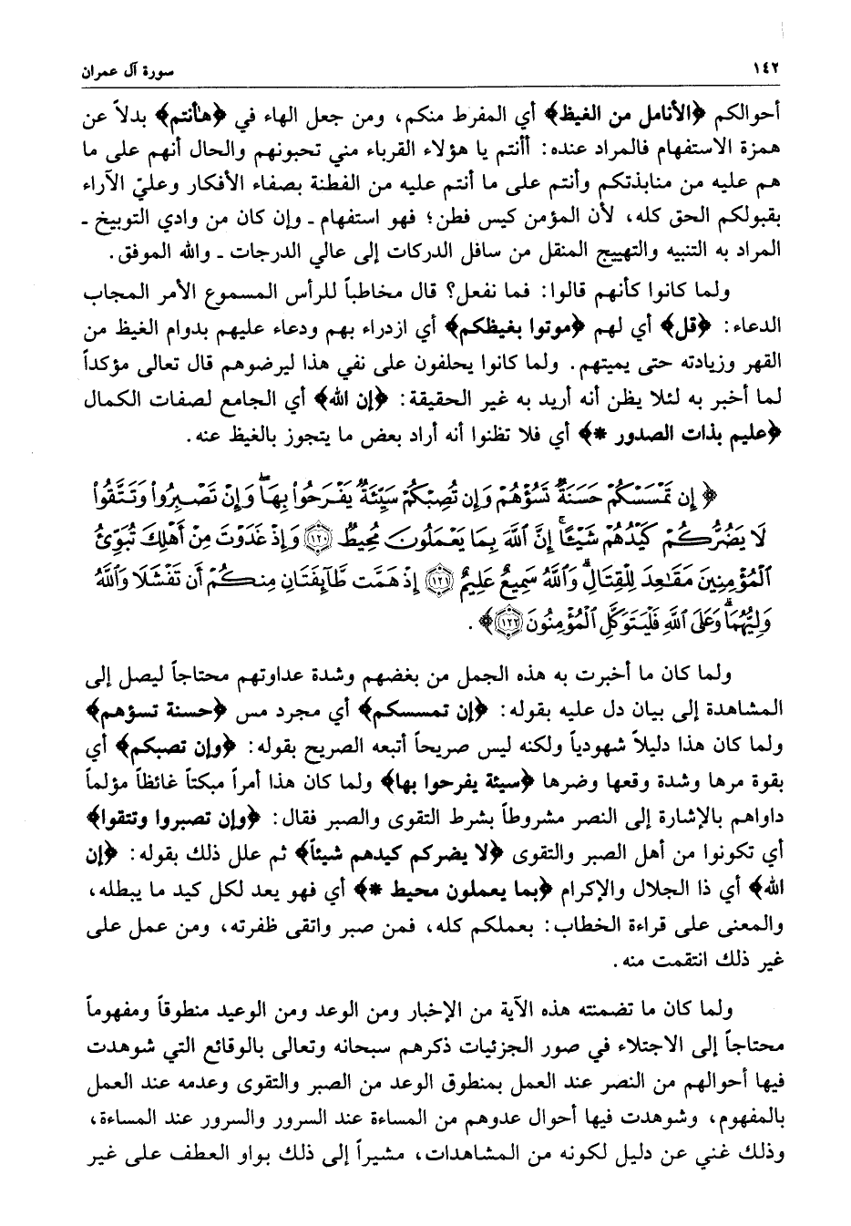 ) إِن تَمْسَسْكُمْ حَسَنَةٌ تَسُؤْهُمْ وَإِن تُصِبْكُمْ سَيِّئَةٌ يَفْرَحُواْ بِهَا وَإِن تَصْبِرُواْ وَتَتَّقُواْ لاَ يَضُرُّكُمْ كَيْدُهُمْ شَيْئاً إِنَّ اللَّهَ بِمَا يَعْمَلُونَ مُحِيطٌ وَإِذْ غَدَوْتَ مِنْ أَهْلِكَ تُبَوِّىءُ الْمُؤْمِنِينَ مَقَاعِدَ لِلْقِتَالِ وَاللَّهُ سَمِيعٌ عَلِيمٌ إِذْ هَمَّتْ طَّآئِفَتَانِ مِنكُمْ أَن تَفْشَلاَ وَاللَّهُ وَلِيُّهُمَا وَعَلَى اللَّهِ فَلْيَتَوَكَّلِ الْمُؤْمِنُونَ ( ( )