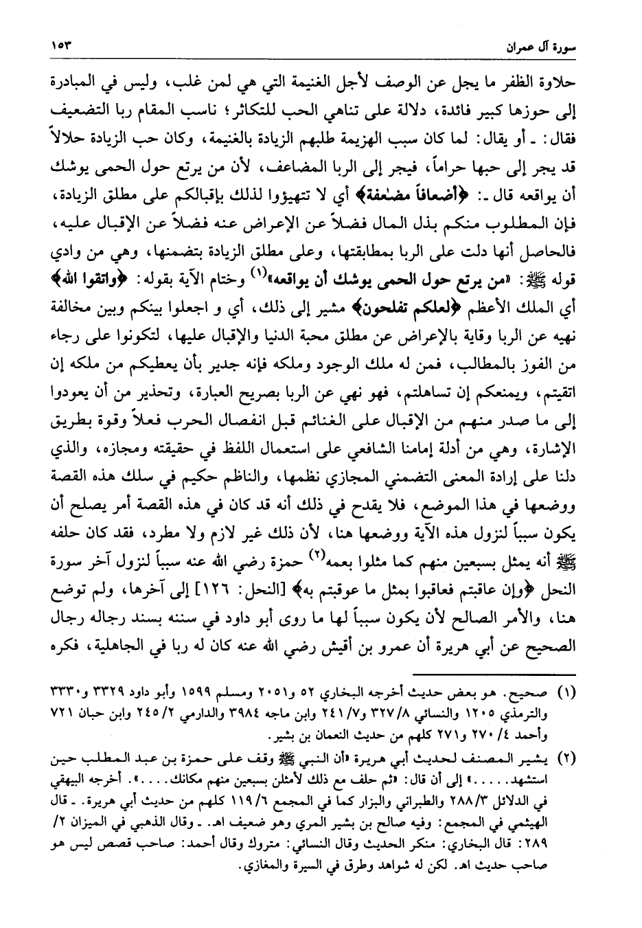 حلاوة الظفر ما يجل عن الوصف لأجل الغنيمة التي هي لمن غلب ، وليس في المبادرة إلى حوزها كبير فائدة ، دلالة على تناهي الحب للتكاثر ، ناسب المقام ربا التضعيف فقال : - أو يقال : لما كان سبب الهزيمة طلبهم الزيادة بالغنيمة ، وكان حب الزيادة حلالاً قد يجر إلى حبها حراماً ، فيجر إلى الربا المضاعف ، لأن من يرتع حول الحمى يوشك أن يواقعه قال - : ( أضعافاً مضاعفة ) أي لا تتهيؤوا لذلك بإقبالكم علىمطلق الزيادة ، فإن المطلوب منكم بذل المال فضلاً عن الإعراض عنه فضلاً عن الإقبال عليه ، فالحاصل أنه دلت على الربا بمطابقتها ، وعلى مطلق الزيادة بتضمنها ، وهي من وادي قوله ( صلى الله عليه وسلم ) : ( من يرتع حول الحمى يوشك أن يواقعه ) وختام الآية بقوله : ( واتقوا الله ) أي الملك الأعظم ) لعلكم تفلحون ( مشير إلى ذلك ، أي واجعلوا بينكم وبين مخالفة نهيه عن الربا وقاية بالإعراض عن مطلق محبة الدنيا والإقبال عليها ، لتكونوا على رجاء من الفوز بالمطالب ، فمن له ملك الوجود وملكه فإنه دير بأن يعطيكم من ملكه إن اتقيتم ، ويمنعكم إن تساهلتم ، فهو نهي عن الربا بصريح لاعبارة ، وتحذير من أن يعودوا إلى ما صدر منهم من الإقبال على الغنائم قبل انفصال الحرب فعلاً وقوة بطريق الإشارة ، وهي من أدلة إمامنا اشلافعي على استعمال اللفظ في حقيقته ومجازه ، والذي دلنا على إرادة المعنى التضمني المجازي نظمها ، والناظن حكيم في سلك هذه القصة ووضعها في هذا الموضع ، فلا يقدح في ذلك أنه قد كان ي هذه القصة أمر يصلح أن يكون سبباً لنزول هذه الآية ووضعها عنا ، لأن ذلك غير لازم ولا مطرد ، فقد كان حلفه ( صلى الله عليه وسلم ) أنه يمثل بسبعين منهم كما مثلوا بعمه حمزة رضي الله عنه سبباً لنزول آخر سورة النحل