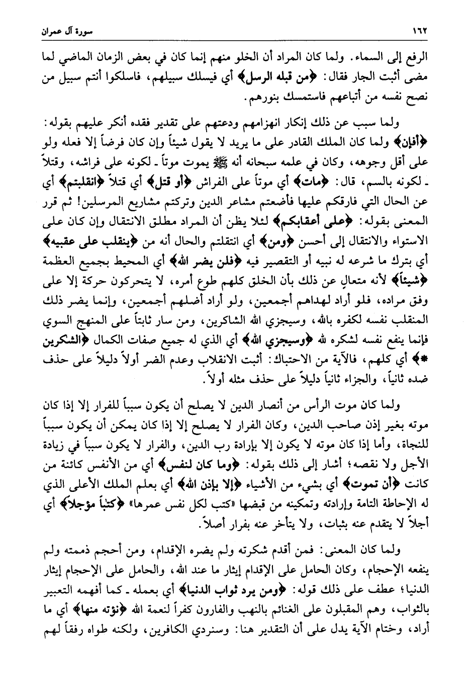 ولما كان موت الرأس من أنصار الدين لا يصلح أن يكون سبباً للفرار إلا إذا كان موته بغير إذن صاحب الدين ، وكان الفرار لا يصلح إلا أذا كان يمكن أن يكون سبباً للنجاة ، وأما إذا كان موته لا يكون إلا بإرادة رب الدين ، والفرار لا يكون سبباً في زيادة الأجل ولا نقصه ؛ أشار إلى ذلك بقوله : ( وما كان لنفس ) أي من الأنفس كائنة من له الإحاطة التامة وإرادته وتمكينه من قبضها ( كتب لكل نفس عمرها ) ) كتاباً مؤجلاً ) أي أجلاً لا يتقدم عنه بثبات ، ولا يتأخر عنه بفرار اصلاً .