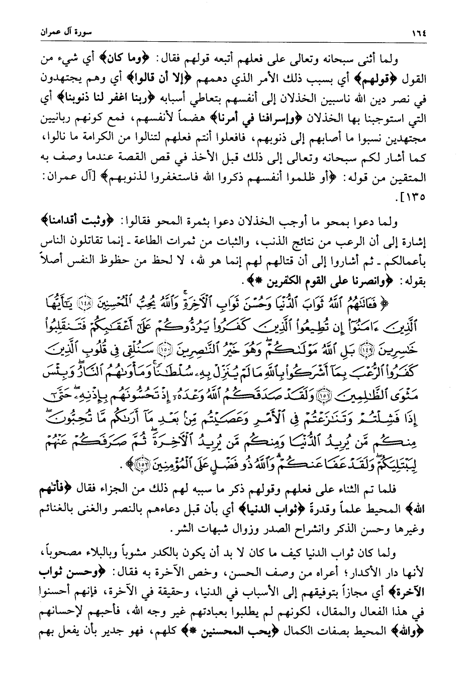) فَآتَاهُمُ اللَّهُ ثَوَابَ الدُّنْيَا وَحُسْنَ ثَوَابِ الآخِرَةِ وَاللَّهُ يُحِبُّ الْمُحْسِنِينَ يَاأَيُّهَا الَّذِينَ آمَنُواْ إِن تُطِيعُواْ الَّذِينَ كَفَرُواْ يَرُدُّوكُمْ عَلَى أَعْقَابِكُمْ فَتَنقَلِبُواْ خَاسِرِينَ بَلِ اللَّهُ مَوْلاَكُمْ وَهُوَ خَيْرُ النَّاصِرِينَ سَنُلْقِي فِي قُلُوبِ الَّذِينَ كَفَرُواْ الرُّعْبَ بِمَآ أَشْرَكُواْ بِاللَّهِ مَا لَمْ يُنَزِّلْ بِهِ سُلْطَاناً وَمَأْوَاهُمُ النَّارُ وَبِئْسَ مَثْوَى الظَّالِمِينَ وَلَقَدْ صَدَقَكُمُ اللَّهُ وَعْدَهُ إِذْ تَحُسُّونَهُمْ بِإِذْنِهِ حَتَّى إِذَا فَشِلْتُمْ وَتَنَازَعْتُمْ فِي الأَمْرِ وَعَصَيْتُمْ مِّن بَعْدِ مَآ أَرَاكُمْ مَّا تُحِبُّونَ مِنكُم مَّن يُرِيدُ الدُّنْيَا وَمِنكُم مَّن يُرِيدُ الآخِرَةَ ثُمَّ صَرَفَكُمْ عَنْهُمْ لِيَبْتَلِيَكُمْ وَلَقَدْ عَفَا عَنْكُمْ وَاللَّهُ ذُو فَضْلٍ عَلَى الْمُؤْمِنِينَ ( ( )