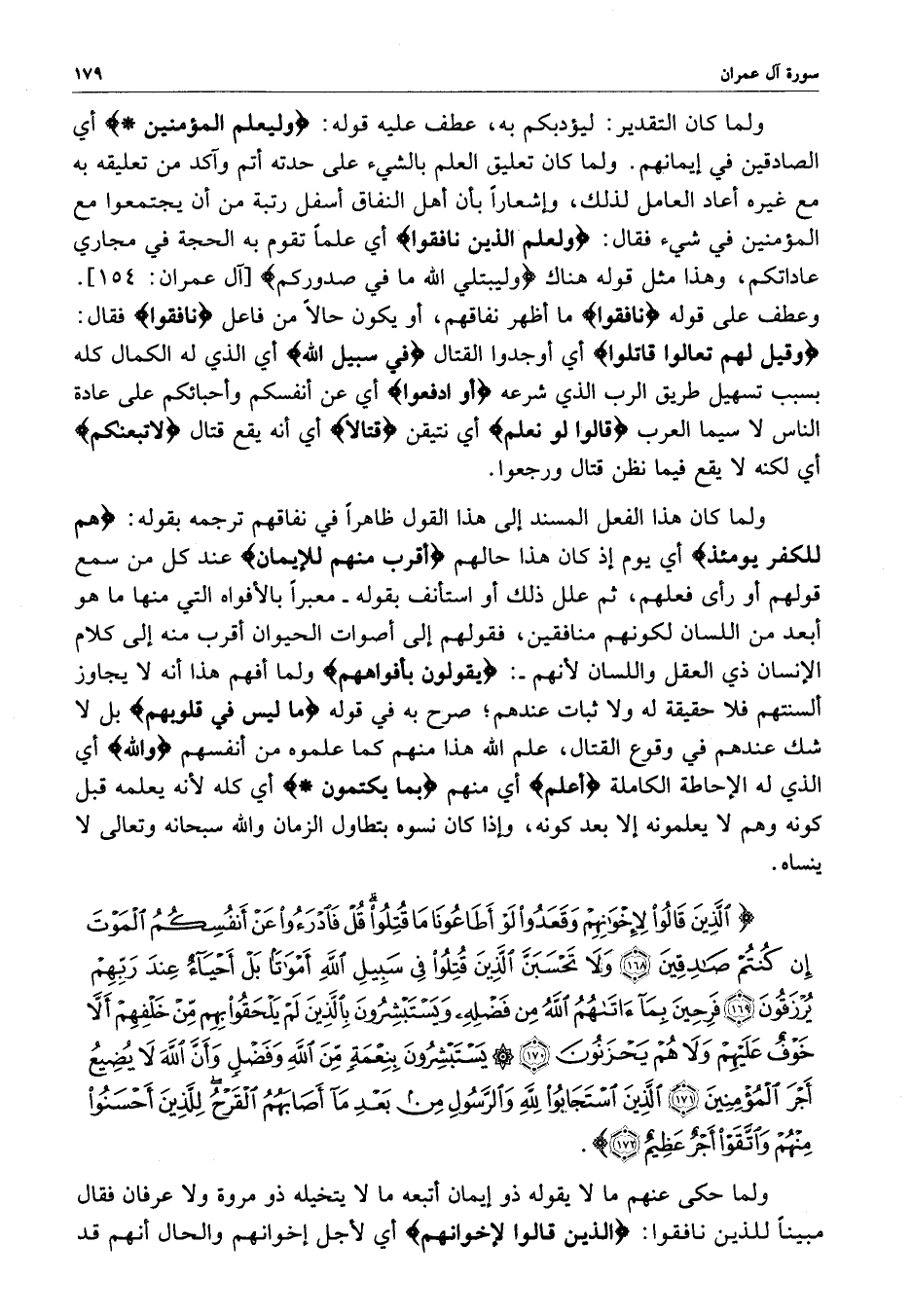 ) الَّذِينَ قَالُواْ لإِخْوَانِهِمْ وَقَعَدُواْ لَوْ أَطَاعُونَا مَا قُتِلُوا قُلْ فَادْرَءُوا عَنْ أَنْفُسِكُمُ الْمَوْتَ إِن كُنْتُمْ صَادِقِينَ وَلاَ تَحْسَبَنَّ الَّذِينَ قُتِلُواْ فِي سَبِيلِ اللَّهِ أَمْوَاتاً بَلْ أَحْيَاءٌ عِندَ رَبِّهِمْ يُرْزَقُونَ فَرِحِينَ بِمَآ آتَاهُمُ اللَّهُ مِن فَضْلِهِ وَيَسْتَبْشِرُونَ بِالَّذِينَ لَمْ يَلْحَقُواْ بِهِم مِّنْ خَلْفِهِمْ أَلاَّ خَوْفٌ عَلَيْهِمْ وَلاَ هُمْ يَحْزَنُونَ يَسْتَبْشِرُونَ بِنِعْمَةٍ مِّنَ اللَّهِ وَفَضْلٍ وَأَنَّ اللَّهَ لاَ يُضِيعُ أَجْرَ الْمُؤْمِنِينَ الَّذِينَ اسْتَجَابُواْ للَّهِ وَالرَّسُولِ مِن بَعْدِ مَآ أَصَابَهُمُ الْقَرْحُ لِلَّذِينَ أَحْسَنُواْ مِنْهُمْ وَاتَّقَواْ أَجْرٌ عَظِيمٌ ( ( )